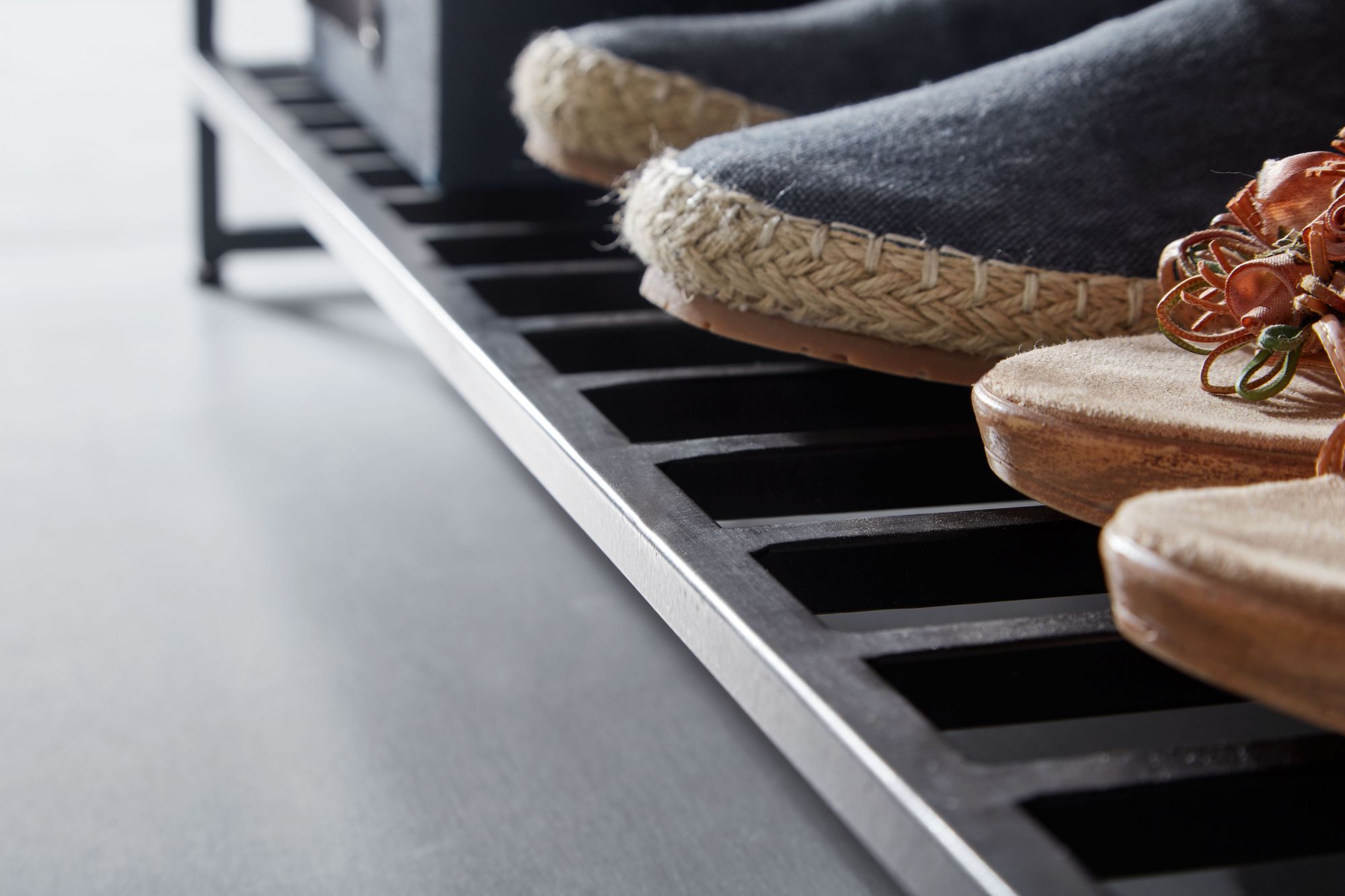 - Farbe: Sitz- und Staufach hellbraun, Rahmen und Schuhablage schwarz.