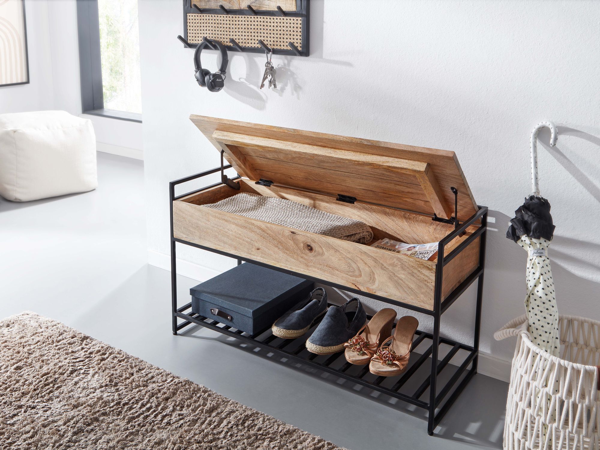 Produktinformationen "Sitzbank mit Stauraum Mango Massivholz / Metall | Hellbraun & Schwarz | 90x52x38 cm"