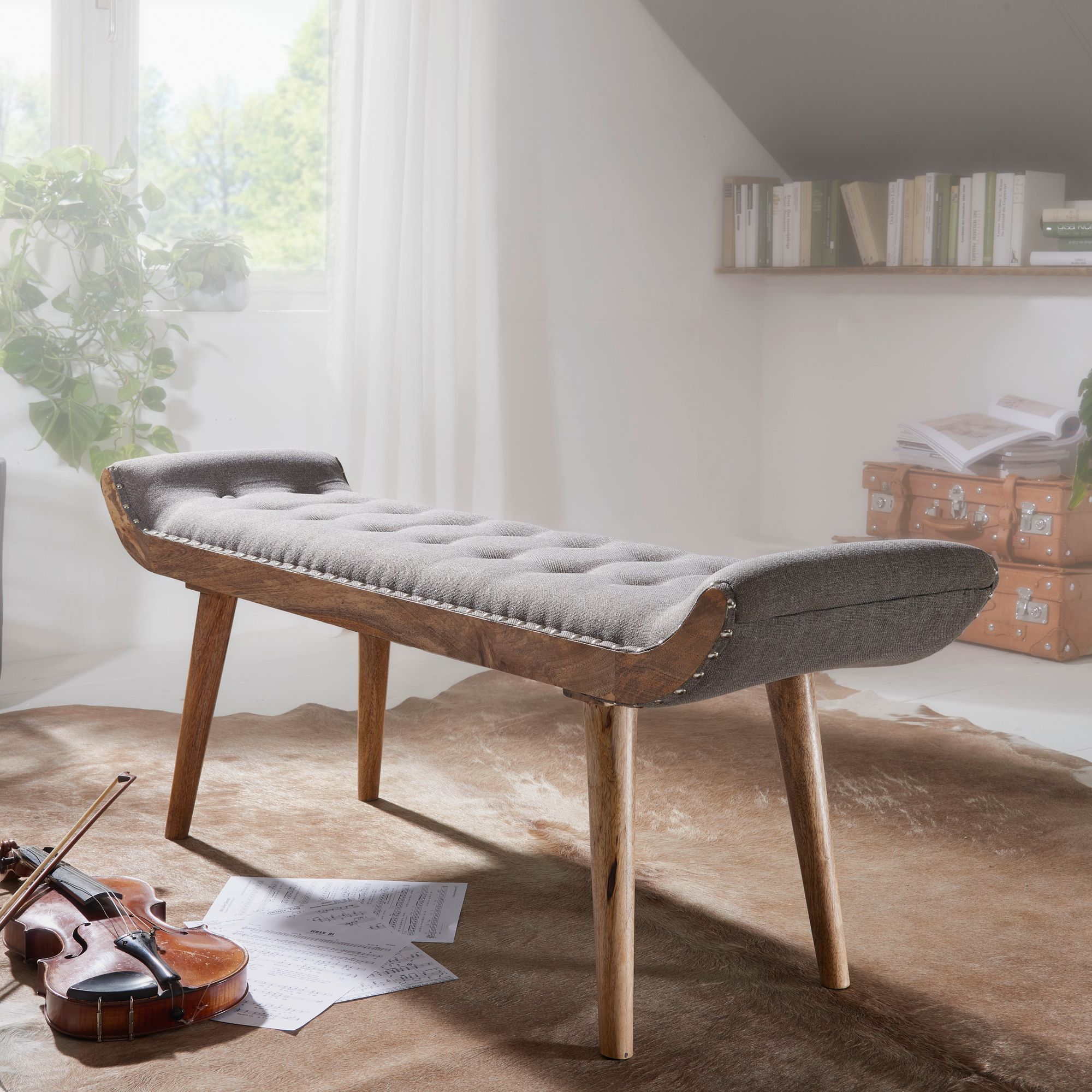 Verleihen Sie Ihrem Zuhause mit dieser grauen Stoffbank im Chesterfield-Design Eleganz. Gefertigt aus massivem Mangoholz und bezogen mit weichem 100 % Polyesterstoff bietet sie eine üppige Polsterung mit elegantem Nietenbesatz.
