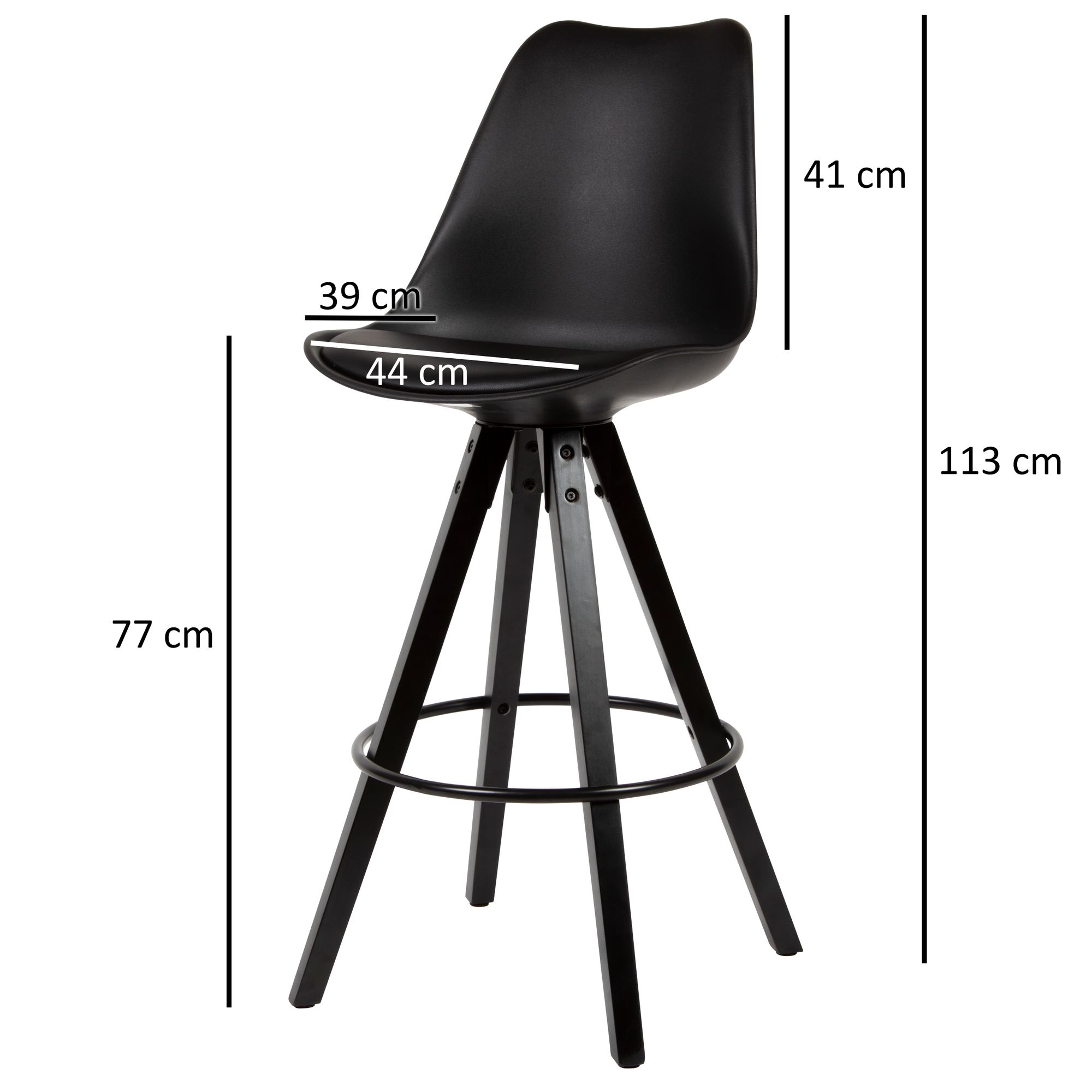 - Materialien: Kunststoffsitz mit Kunstlederbezug, schwarze Hevea-Massivholzbeine, Metallfußstütze