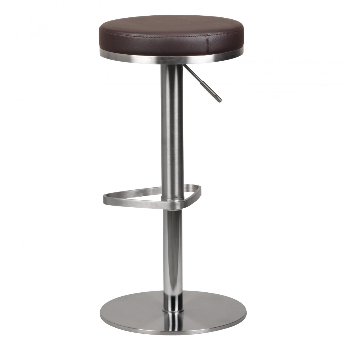 Moderner Barhocker mit verchromtem Edelstahlgestell und runder, großzügig gepolsterter brauner Sitzfläche für besten Sitzkomfort. Die Sitzhöhe ist von 57 bis 82 cm höhenverstellbar und ermöglicht eine perfekte Anpassung an Körpergröße und Raum.