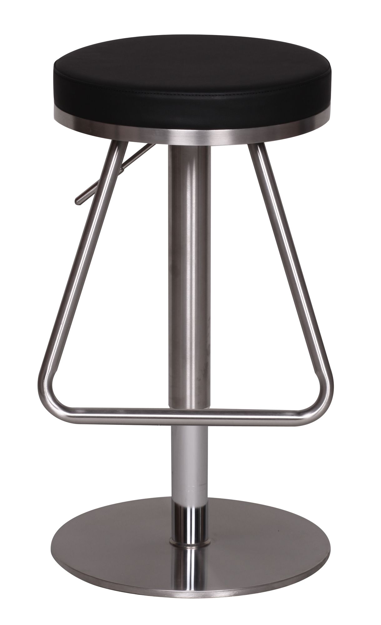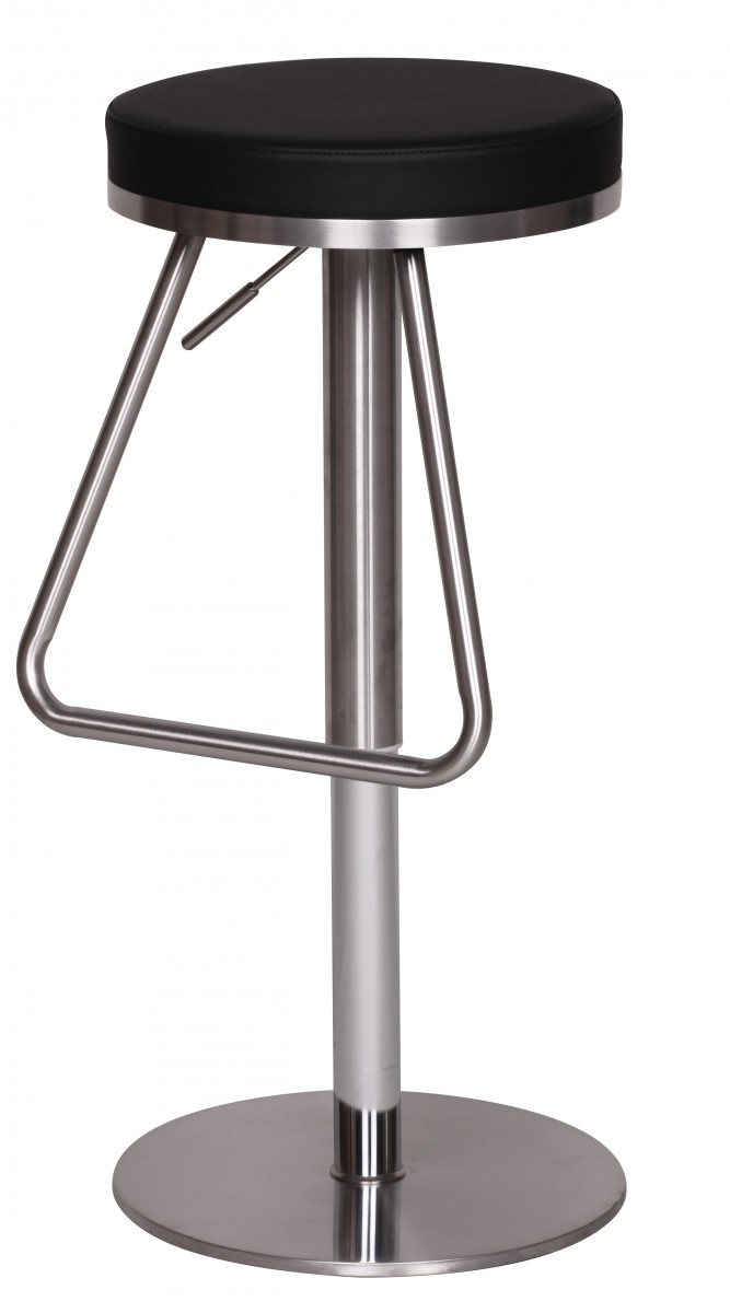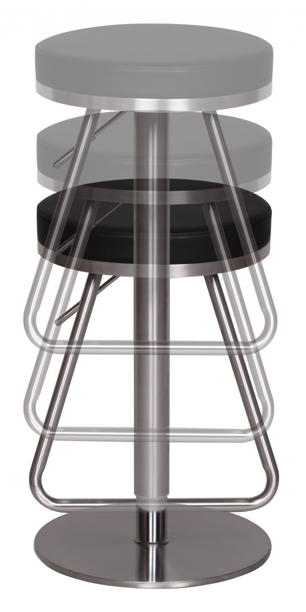 Dieser moderne Barhocker verbindet ein edles Design mit optimalem Komfort durch höhenverstellbare Sitzfläche von 54 bis 79 cm. Die runde, üppig gepolsterte schwarze Sitzfläche ist von einem eleganten verchromten Edelstahlring eingefasst.