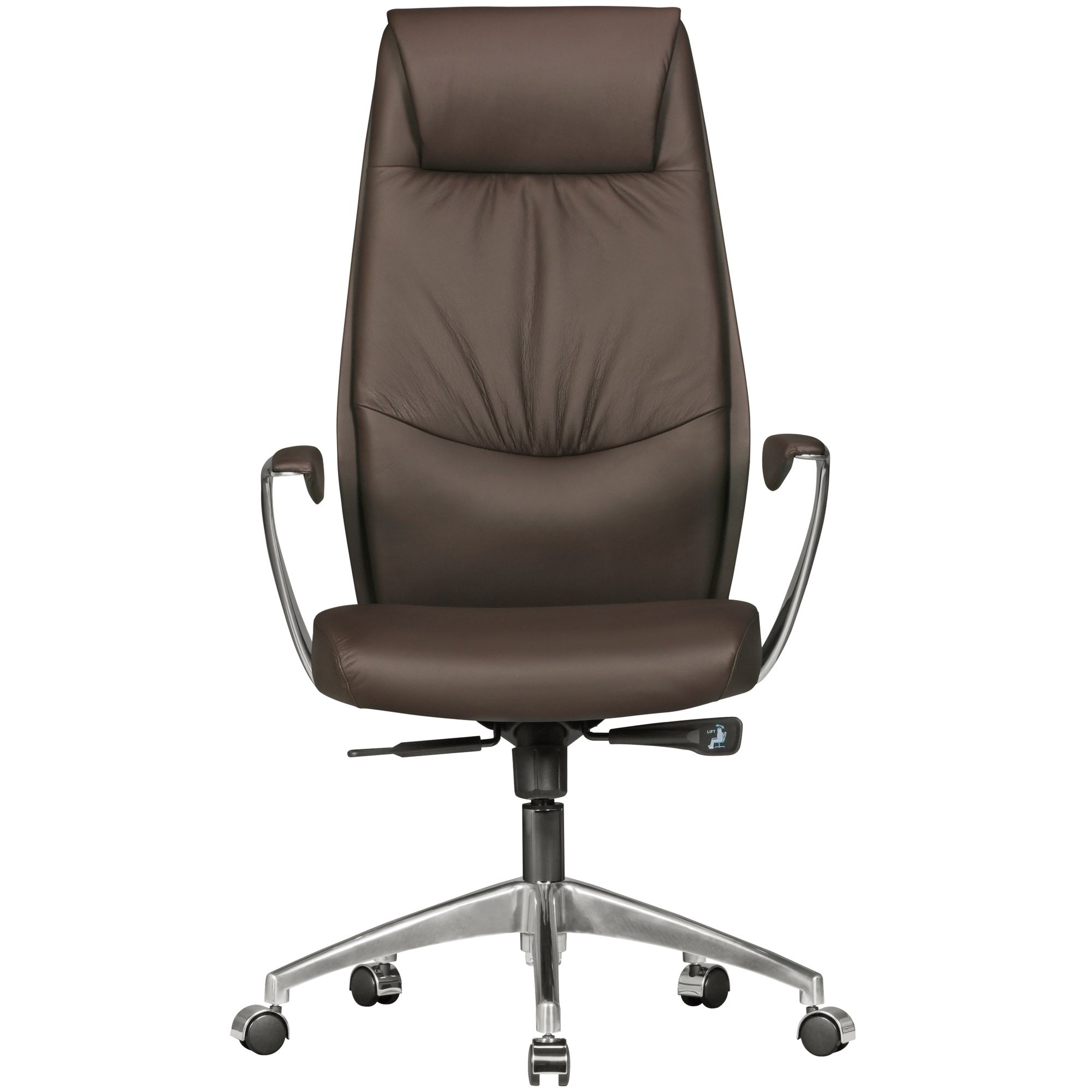 Komfortabler XXL-Bürostuhl aus braunem Echtleder, geeignet für intensiven Gebrauch mit ergonomischer Unterstützung und synchroner Mechanik mit Gewichtseinstellung. Aluminiumarmlehnen mit Softpads sorgen für eine ergonomische Sitzhaltung. Breite Rückenlehne und Sitz für hohen Komfort.