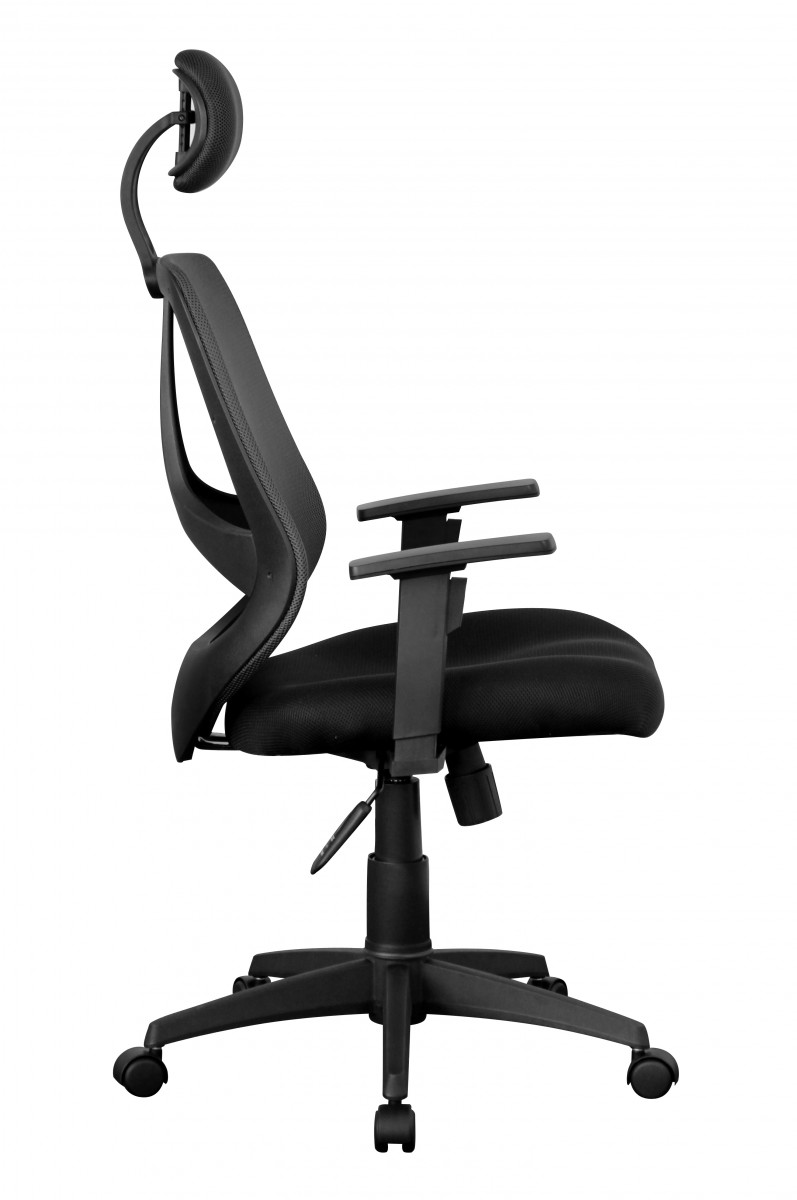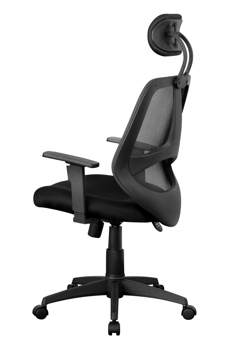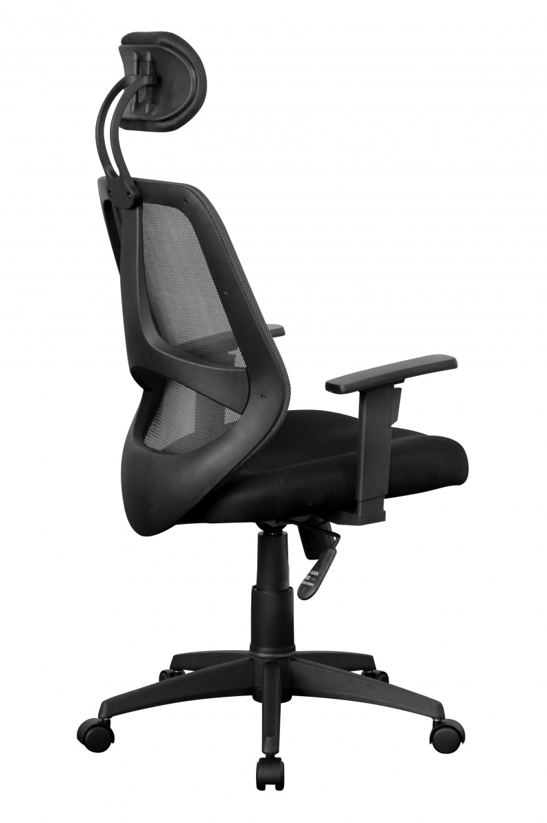Ergonomischer Bürostuhl mit schwarzem Stoffbezug, geeignet für bis zu 8 Stunden komfortable Nutzung täglich. Verfügt über gut gepolsterte Sitzfläche, höhenverstellbare Kopfstütze und Armlehnen sowie lendenwirbelfördernde Rückenlehne mit atmungsaktivem Netzbezug.