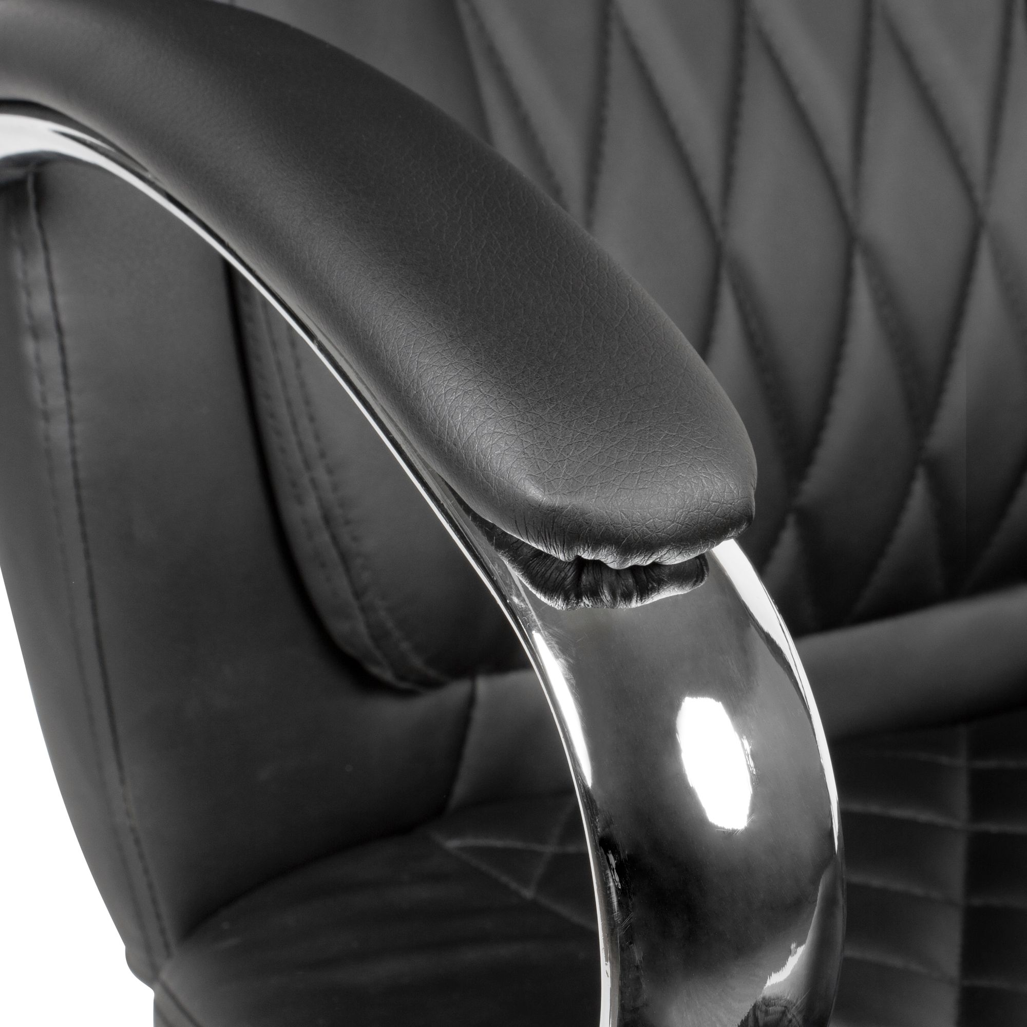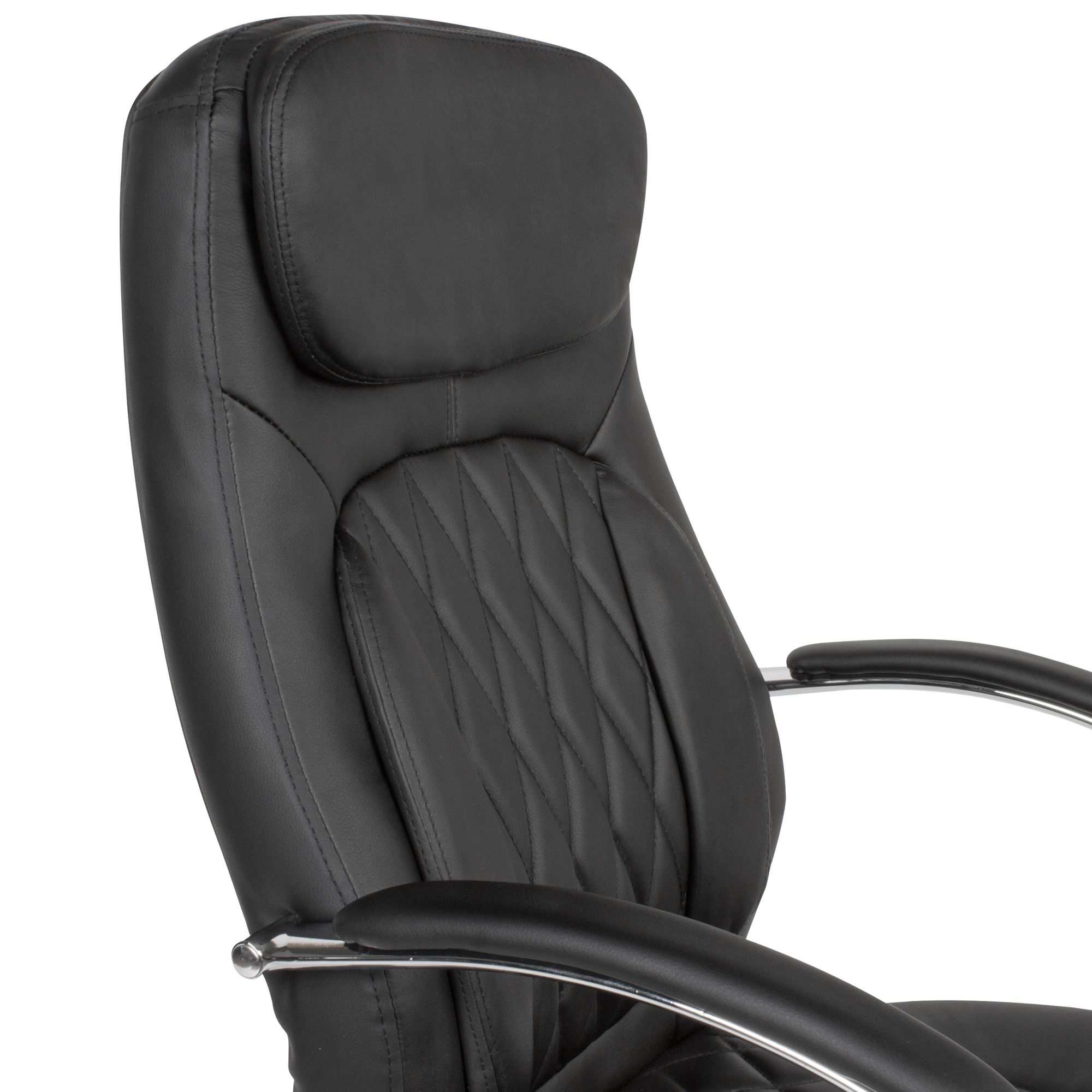 Dieser schwarze Bürodrehstuhl aus Kunstleder verbindet Eleganz und Komfort für intensive Nutzung. Modernes Design mit weicher Polsterung und Rautenmuster auf Sitzfläche und Rückenlehne sorgt für angenehmes Sitzen. Armlehnen und das stabile Fußkreuz aus Stahl bieten hohe Standfestigkeit bis 120 kg Belastung.