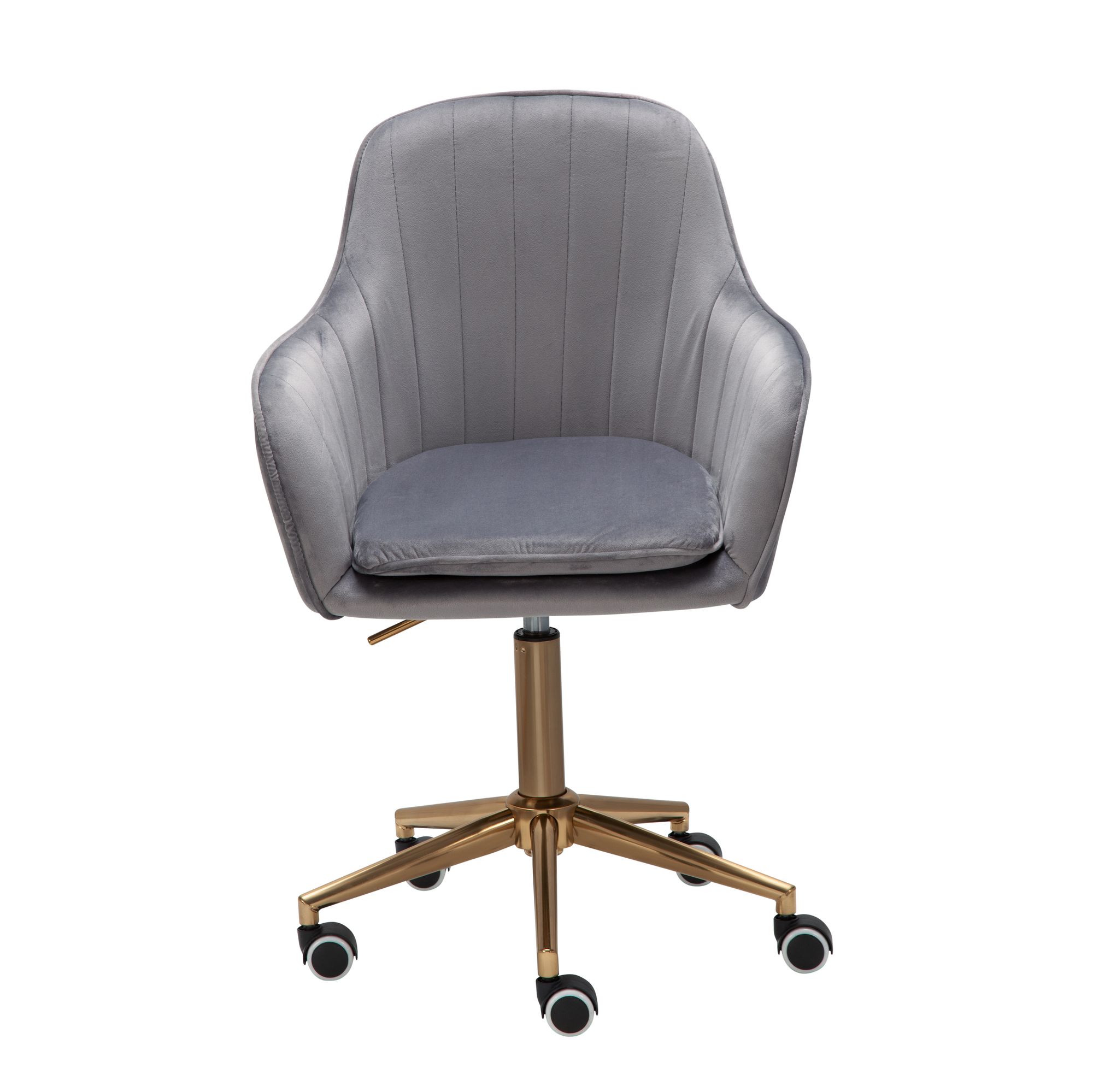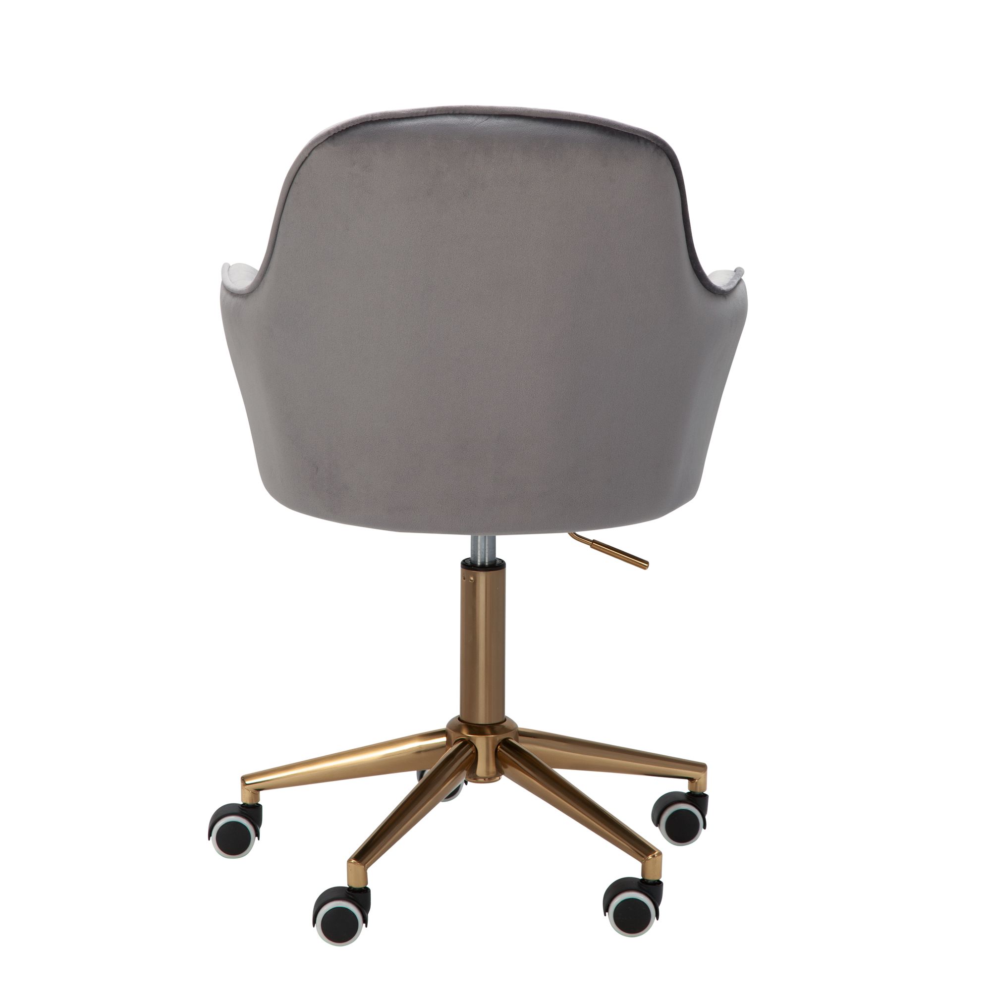 Moderner Schreibtischstuhl in elegantem grauem Samt mit ergonomisch geformter Sitzschale für hohen Sitzkomfort. Das goldene metallene Fußkreuz verleiht dem Stuhl ein edles Design. Durch die kompakte Größe ideal für kleine Arbeitsbereiche, höhenverstellbar (43-63 cm) und belastbar bis 120 kg.