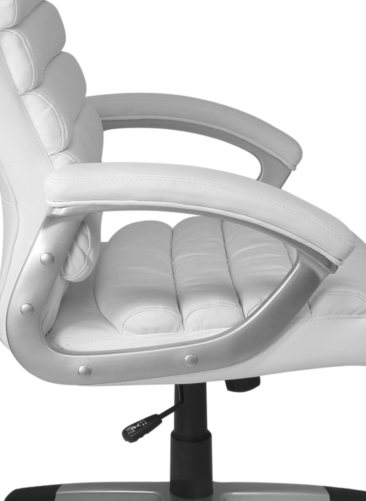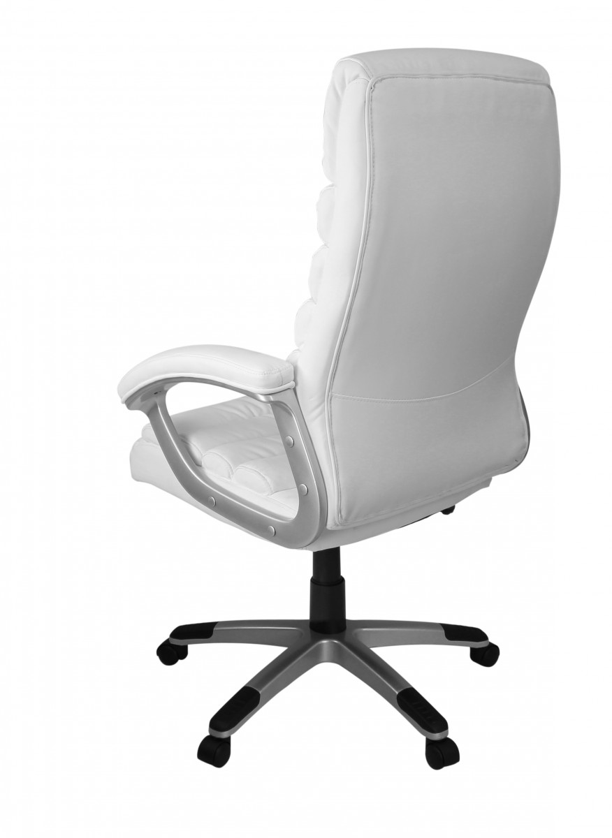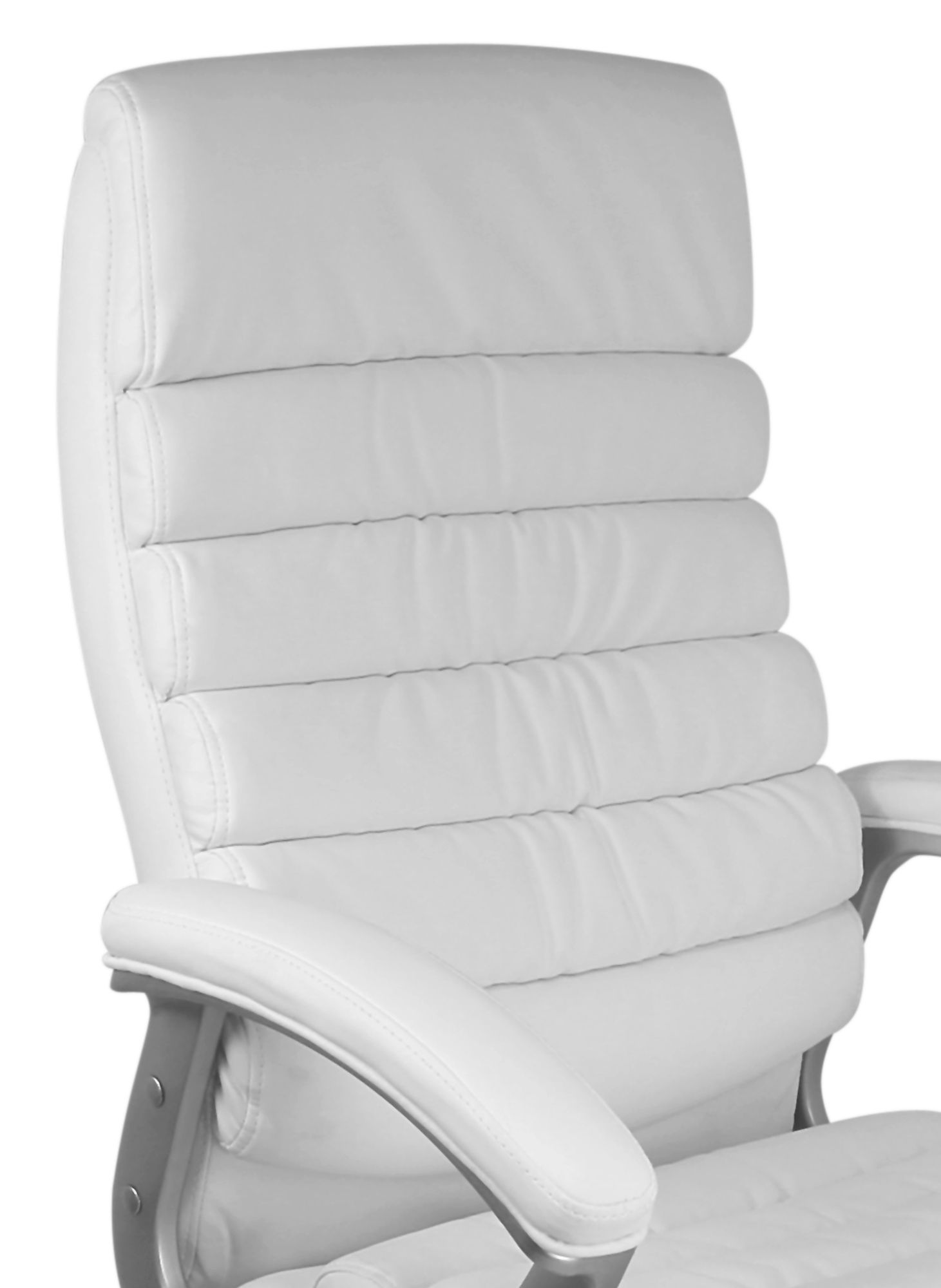 Der Valencia Bürostuhl aus weißem Kunstleder vereint Komfort und elegante Verarbeitung mit hoher Rückenlehne und integriertem Kopfstütze. Die großzügige Polsterung und ergonomische Struktur mit integrierter Lendenstütze sorgen für bequemen Sitz über längere Zeit.