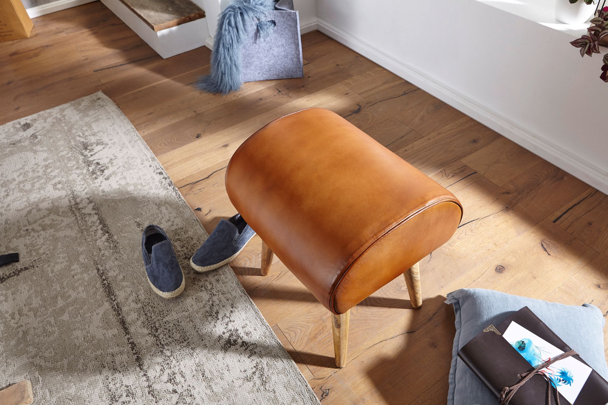 Moderner Sitzhocker im schlichten Design aus echtem Ziegenleder und massivem Mangoholz, der Stil und Komfort vereint. Die braune Farbgebung schafft eine warme Atmosphäre.