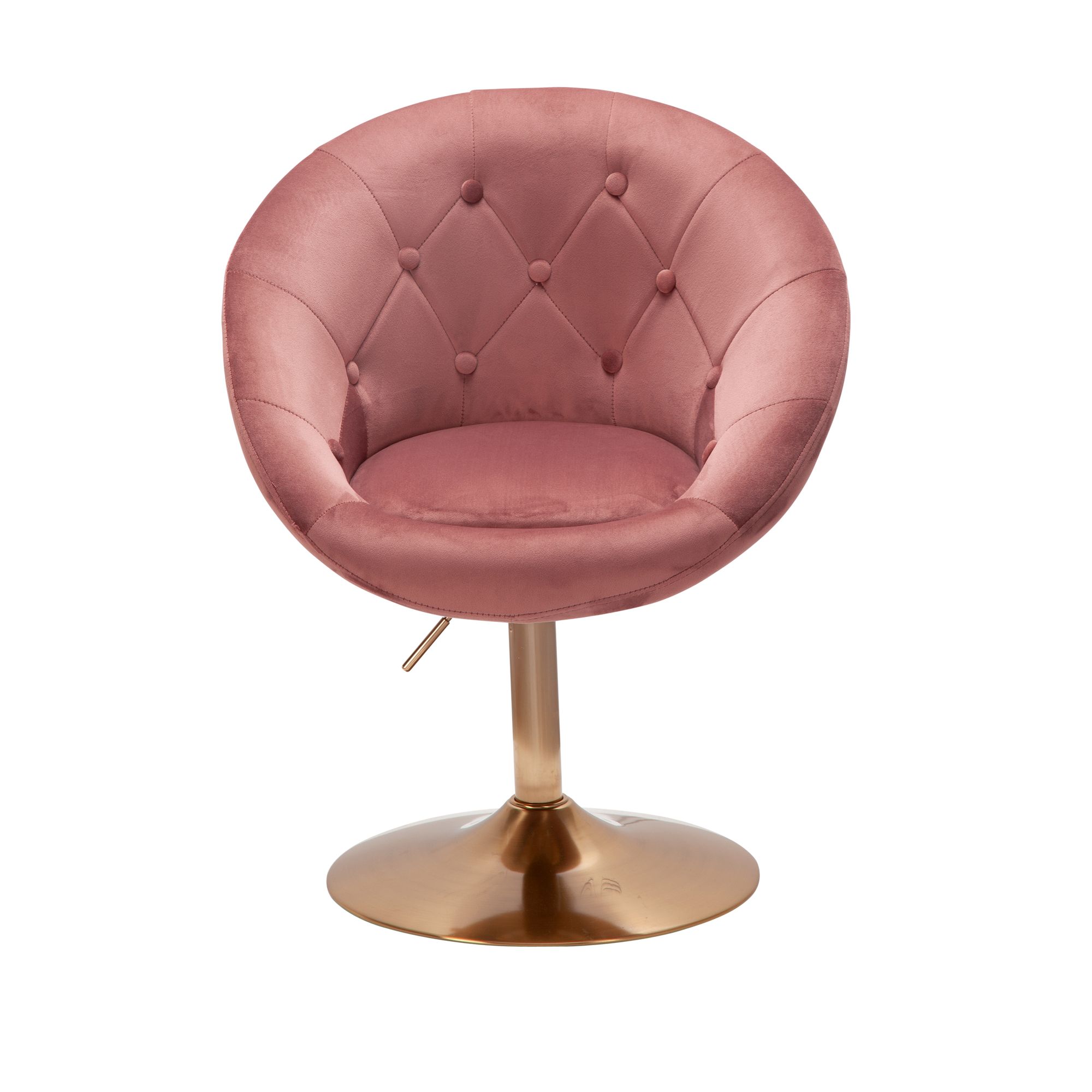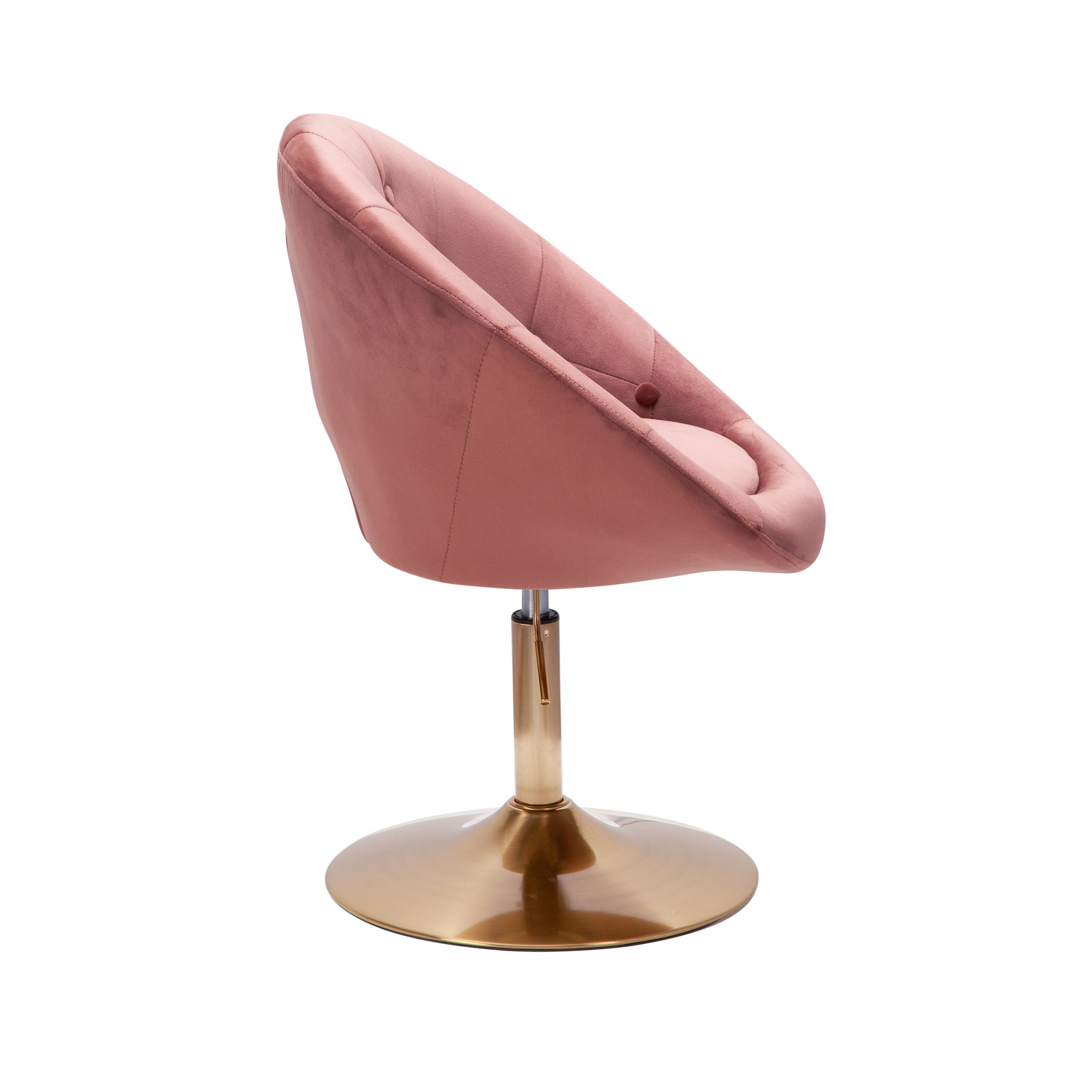 Bequemer Loungesessel aus rosa Samt mit Chesterfield-Muster und stabilem, goldfarbenem Metallfuß. Die weiche Sitzschale bietet stundenlangen Komfort und ist dank Drehfunktion um 360° vielseitig einsetzbar als Cocktailsessel oder Bürostuhl.