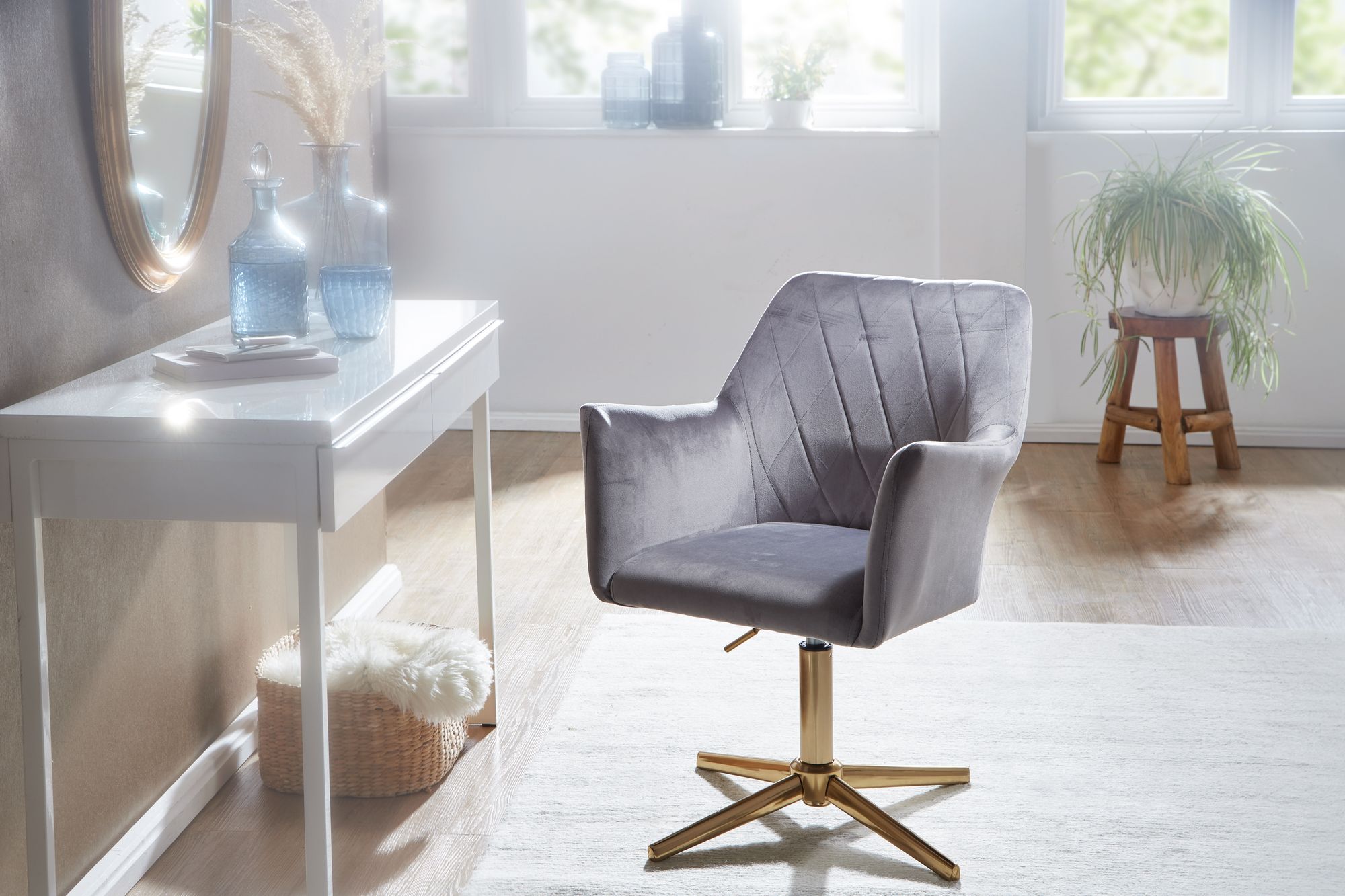 Produktinformationen "Schreibtischstuhl Grau Samt mit Armlehnen | Gold lackiertes Eisen | Höhenverstellbar 80-97 cm"