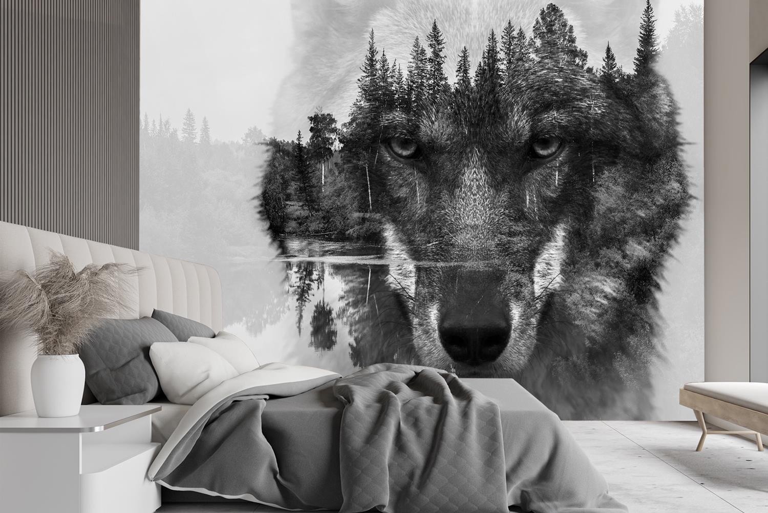 Fototapete für wohnzimmer im abstrakten und modernen stil waldtiere wolf und nebel