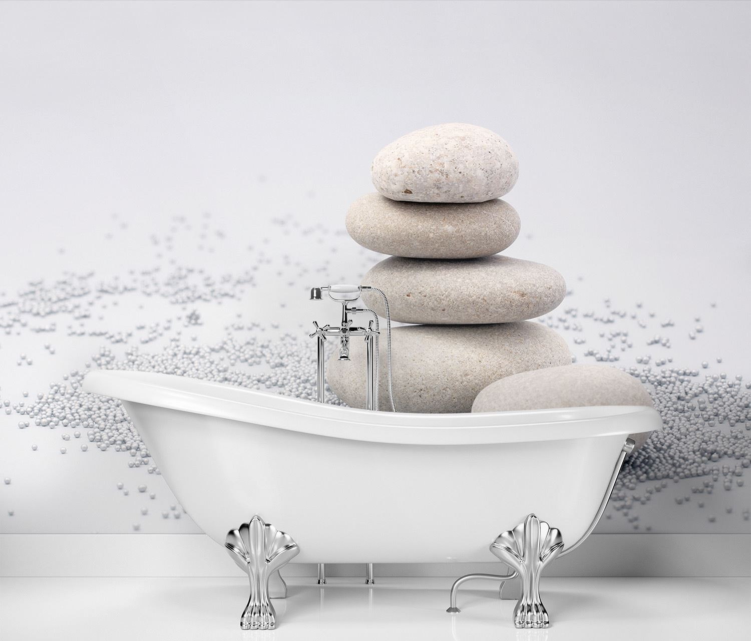 Beschreibung und Eigenschaften – Tapete mit gestapelten weißen Zen-Kieseln auf einem grauen Hintergrund mit Farbverlauf