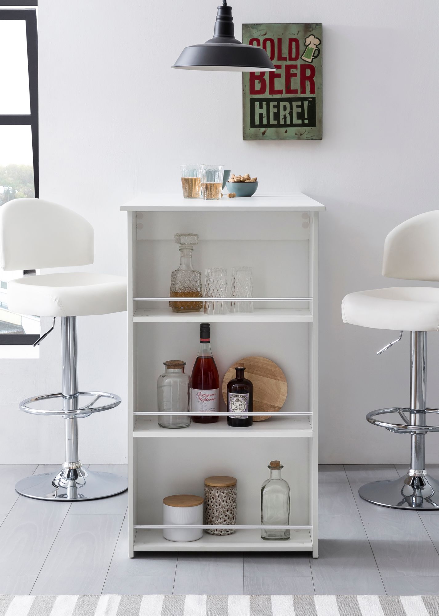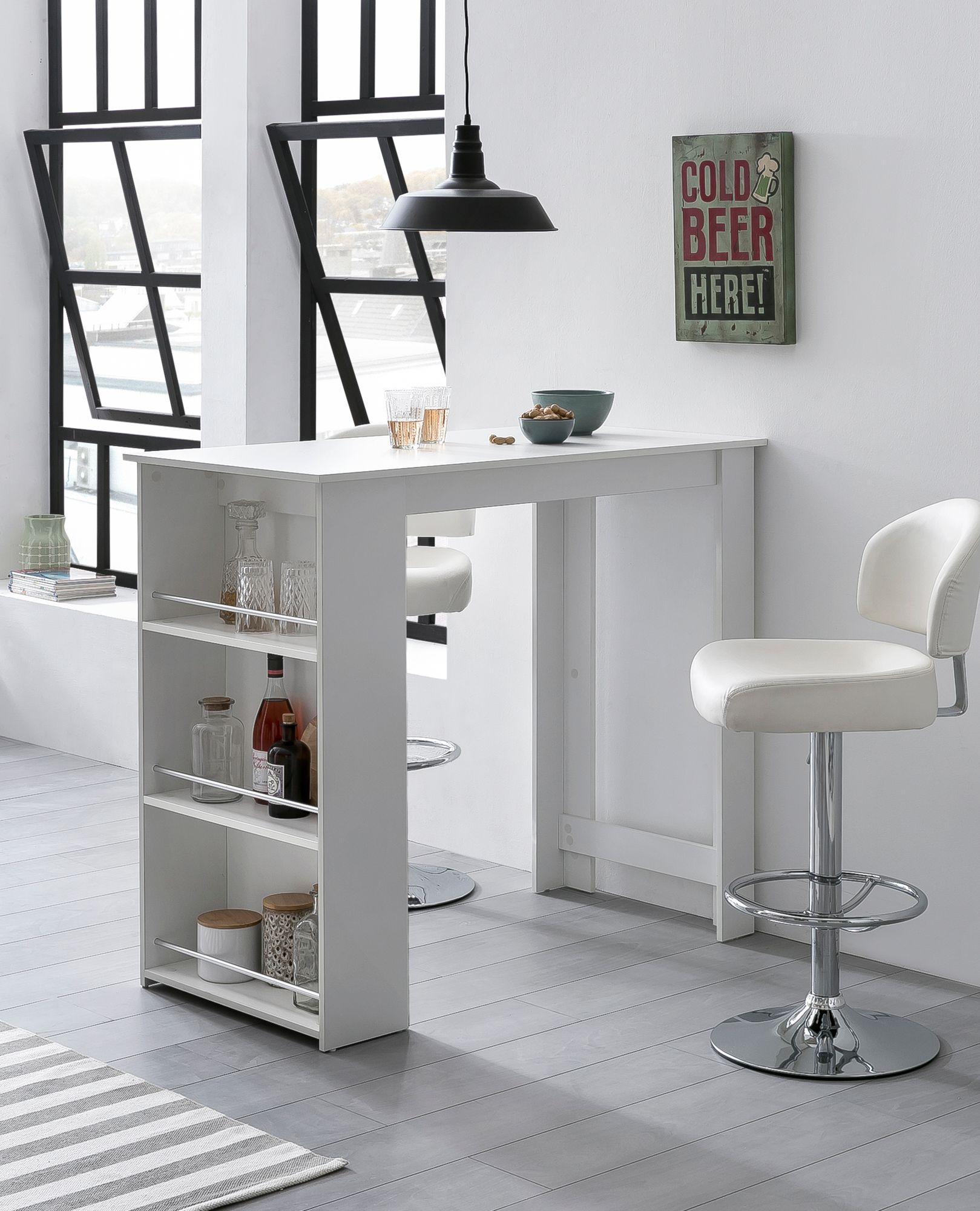 Dieser weiße Bartisch besticht durch modernes, geradliniges Design und große Ablagefläche mit drei integrierten Regalfächern für Weinflaschen, Gläser und Küchenutensilien. Silberne Aluminiumstreben verhindern das Herausfallen der Gegenstände.