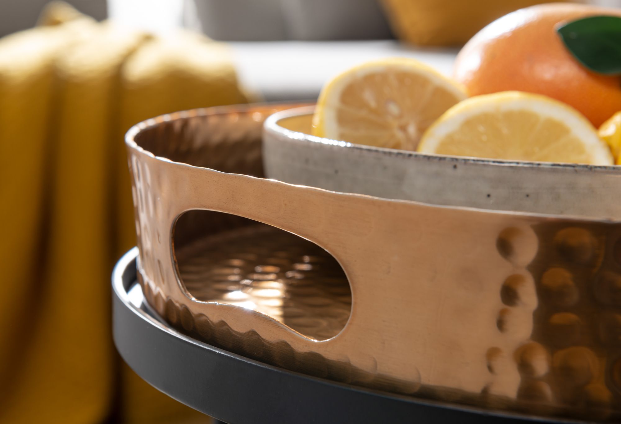 Entdecken Sie dieses 2-teilige Set runder Beistelltische aus Metall, das Eleganz und Funktionalität vereint. Die goldfarbenen Aluminium-Tischplatten mit markanter Hammerschlag-Struktur verleihen Ihrem Raum eine moderne, unverwechselbare Note. Das Gestell aus schwarzem Stahl sorgt für Stabilität und Langlebigkeit.