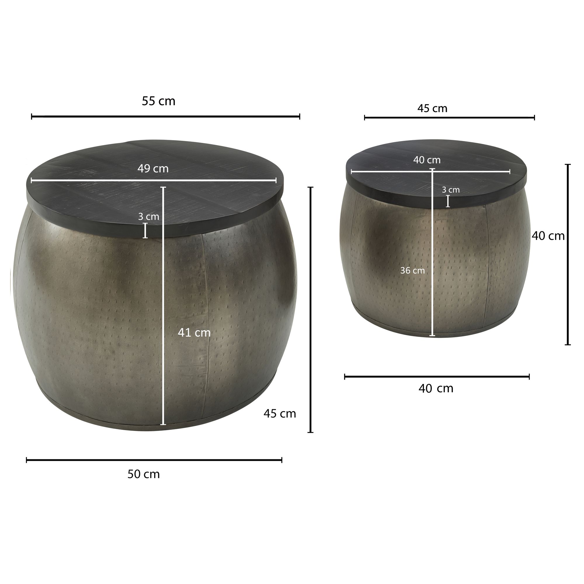 2er Set Couchtische Mango Massivholz Schwarz 55/45x45/40x55/45 cm | Silber Metall Industrial | Rund mit Stauraum