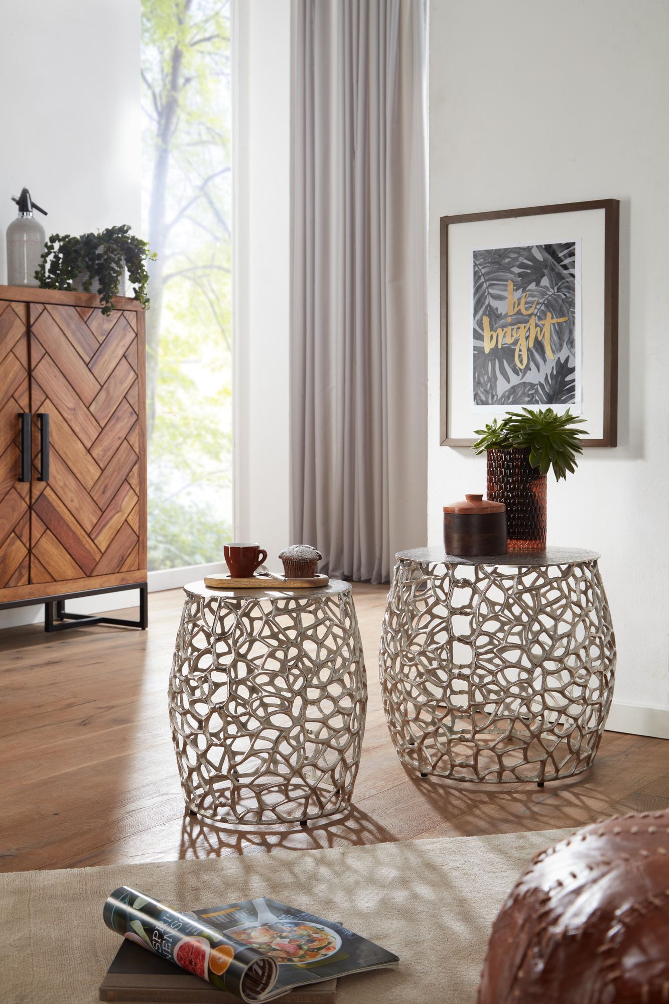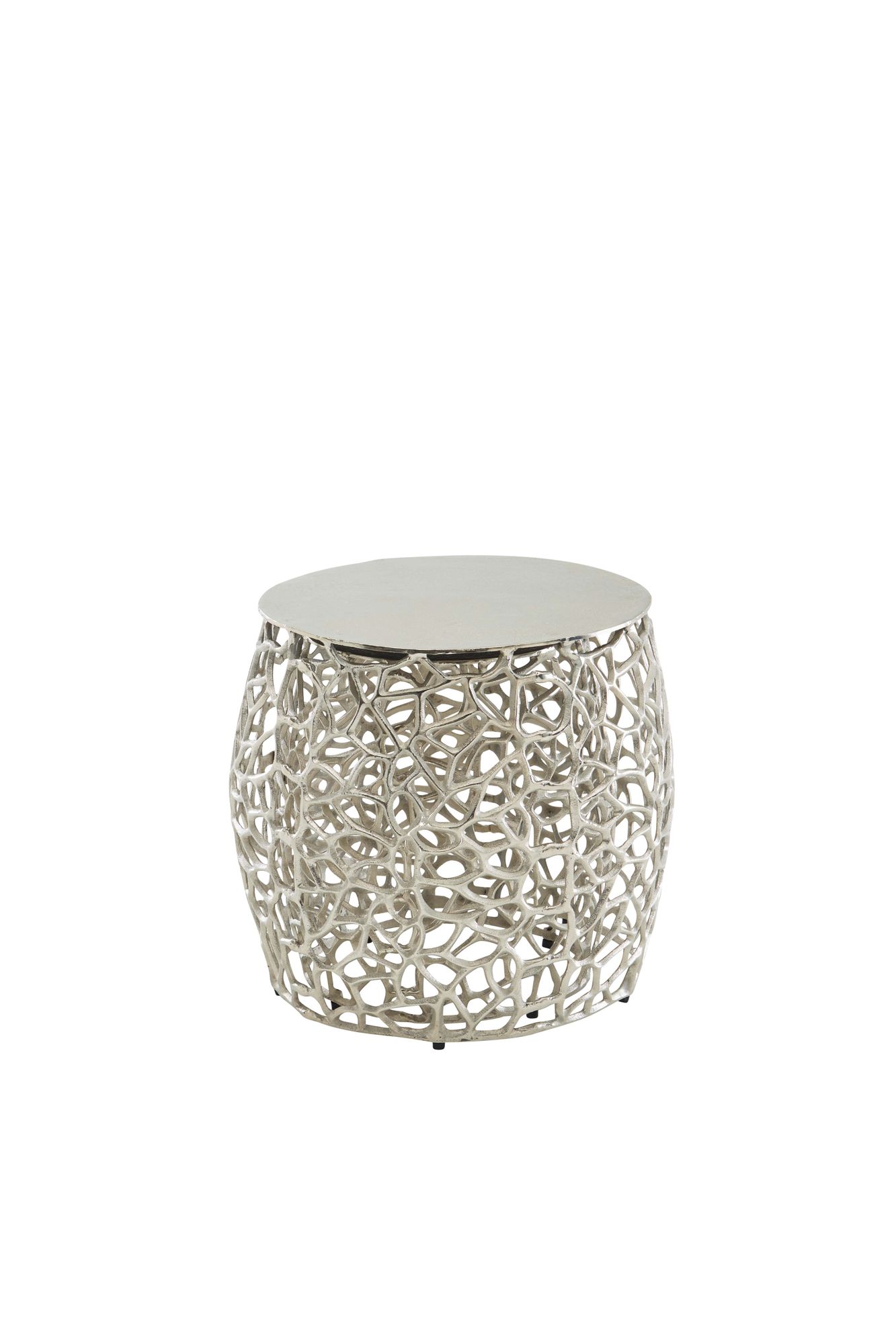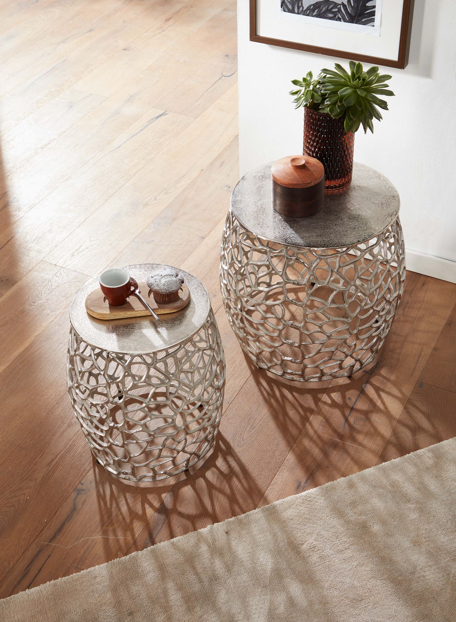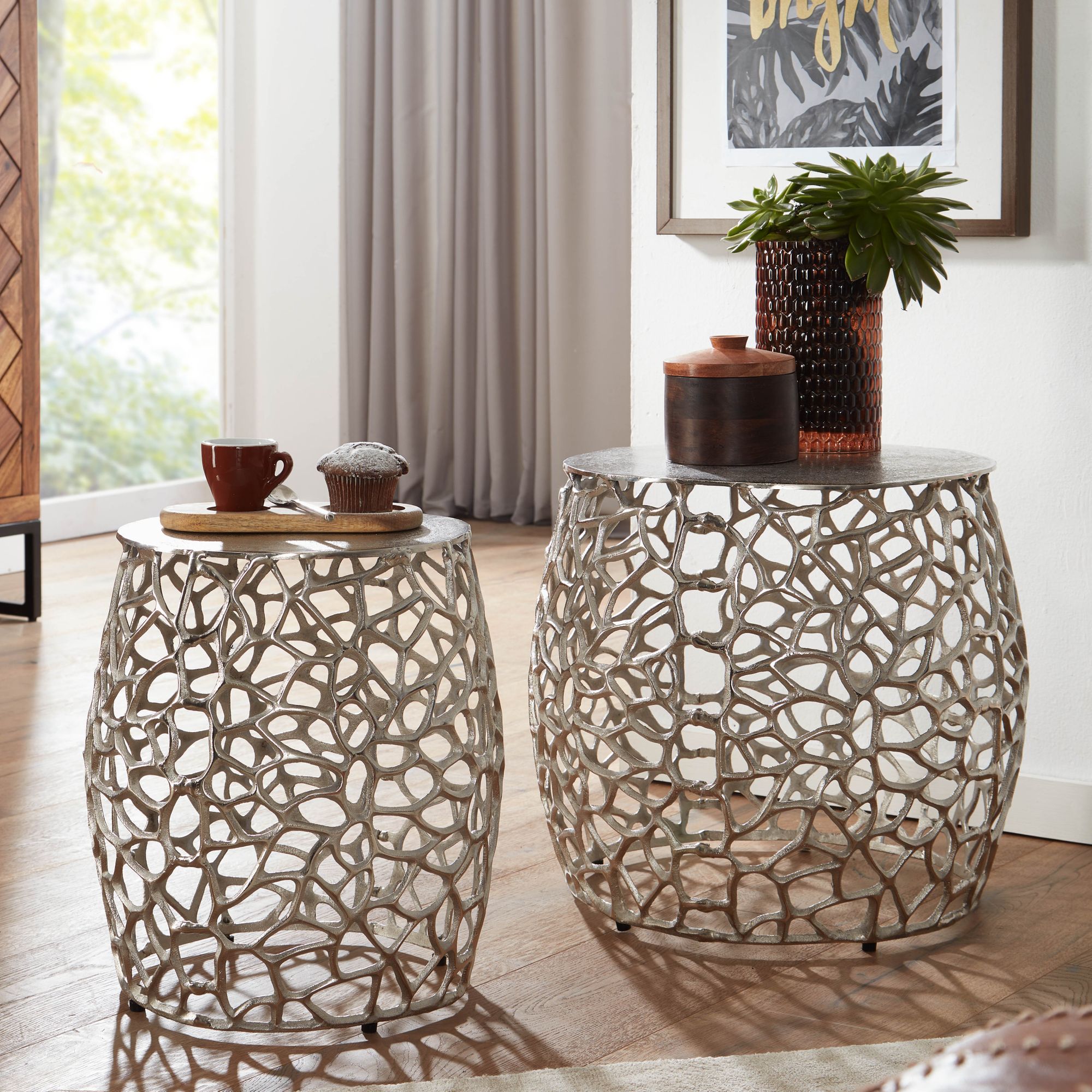 Dieses 2-teilige Beistelltisch-Set aus silbernem Aluminium verbindet modernes Design mit praktischer Funktionalität. Die ausgefallene Aststruktur verleiht jedem Tisch eine natürliche und elegante Optik.