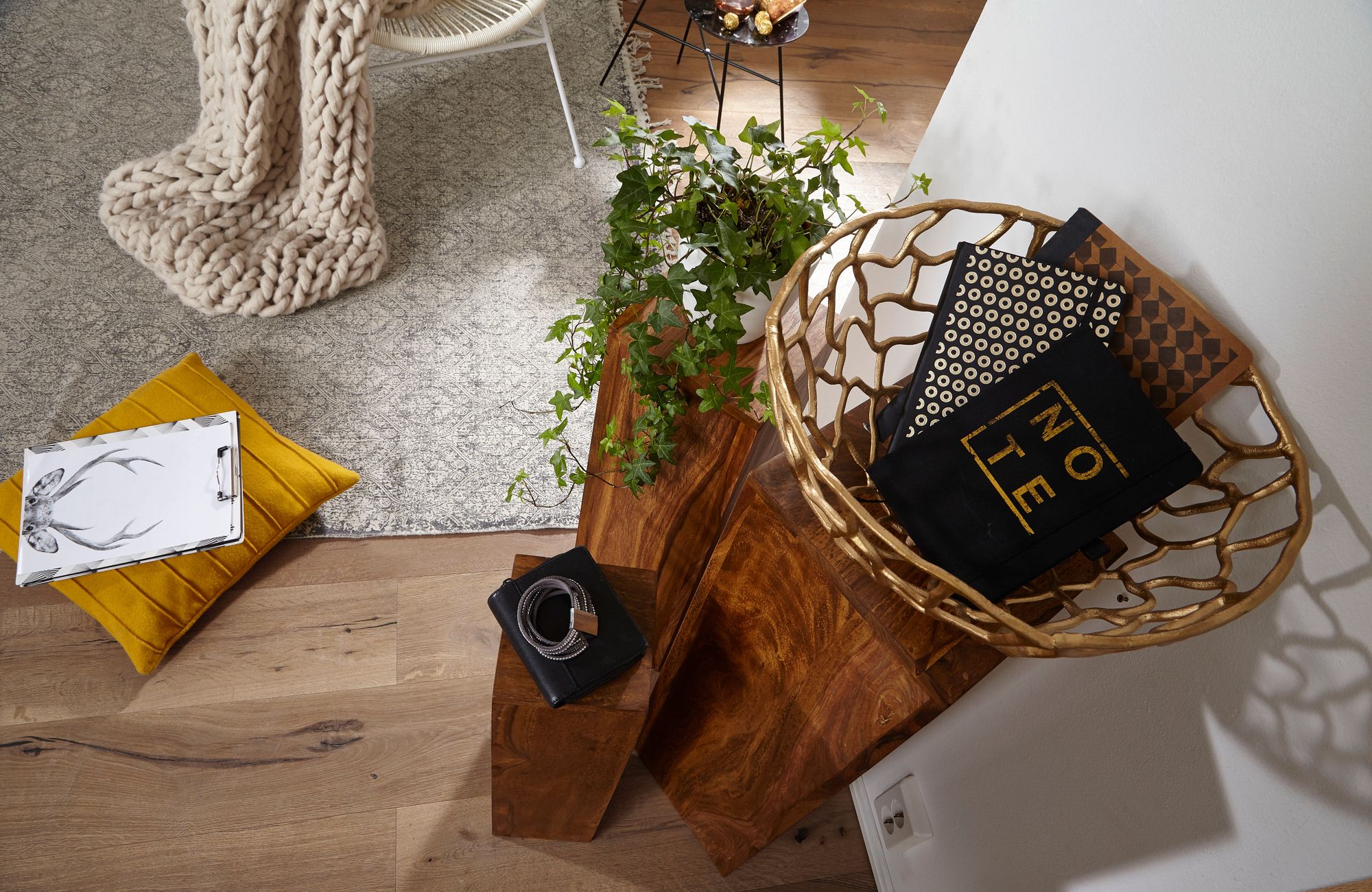 Entdecken Sie dieses 3-teilige Beistelltisch-Set aus massivem Sheeshamholz, das modernes Design mit natürlicher Robustheit verbindet. Jeder Tisch ist handgefertigt und zeigt die einzigartige Maserung des Sheeshamholzes.