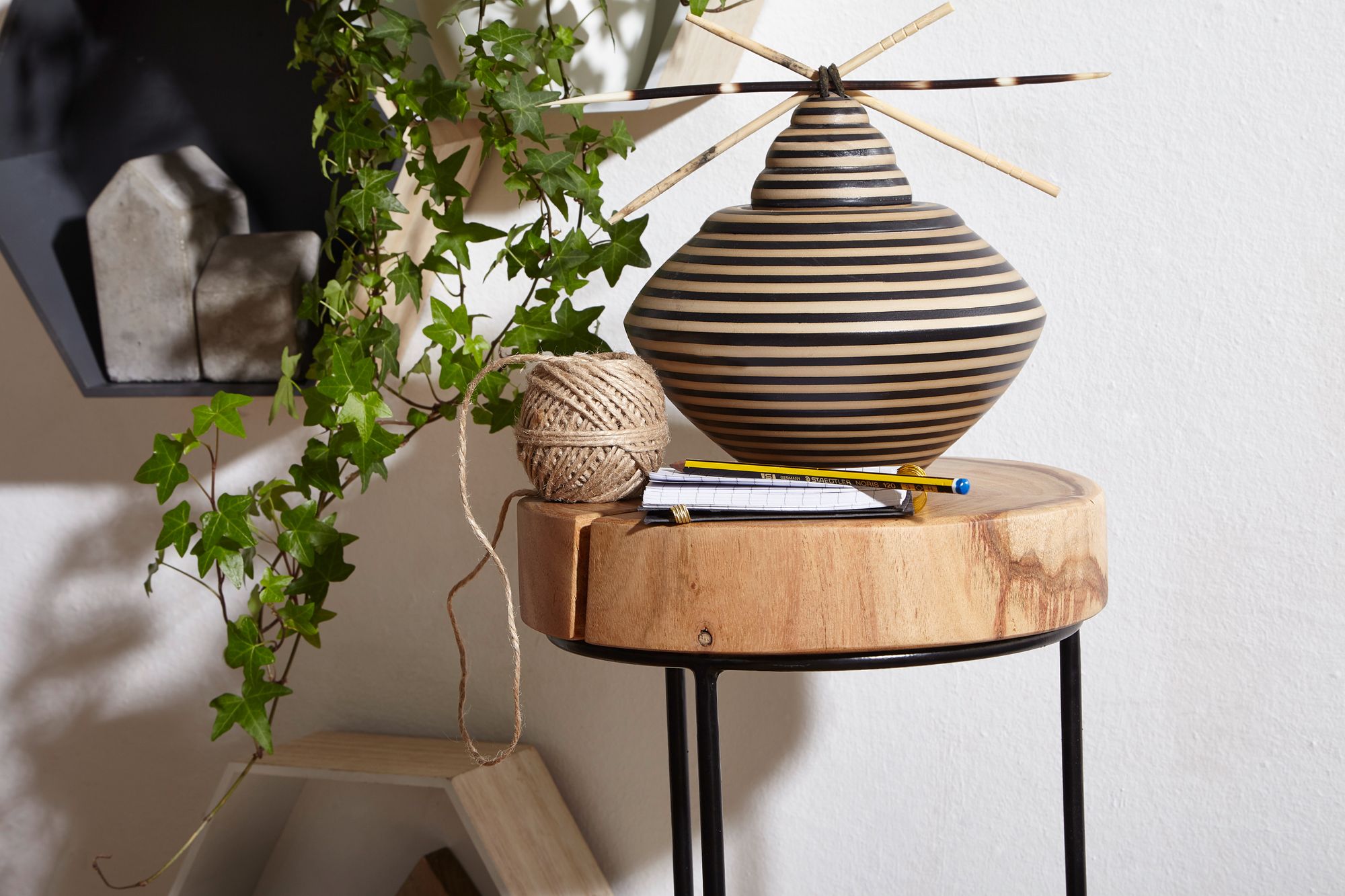 Der Beistelltisch AKOLA aus massivem Akazienholz besticht durch seine Baumstammförmige Tischplatte und das extravaganze Metallgestell, gefertigt als handwerkliches Unikat.