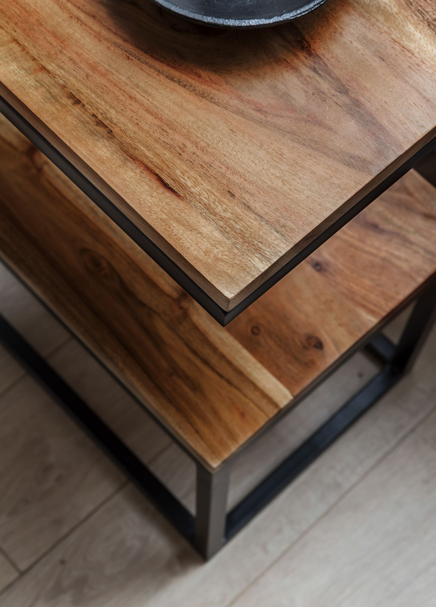 - Materialien: Ablagen aus massivem Sheeshamholz, Gestell pulverbeschichtetes Metall.