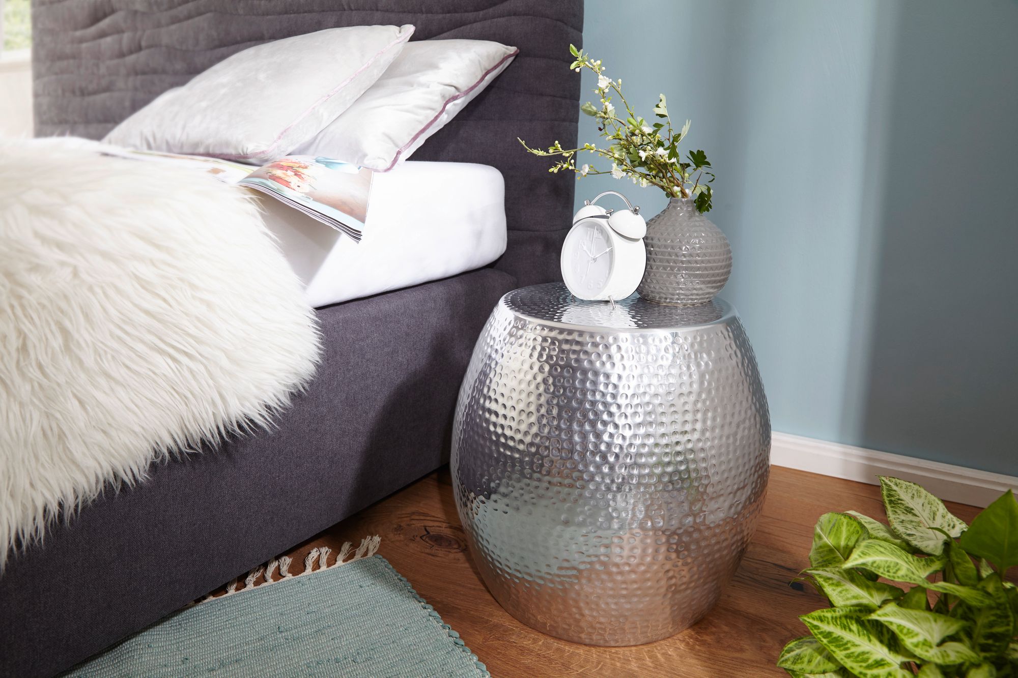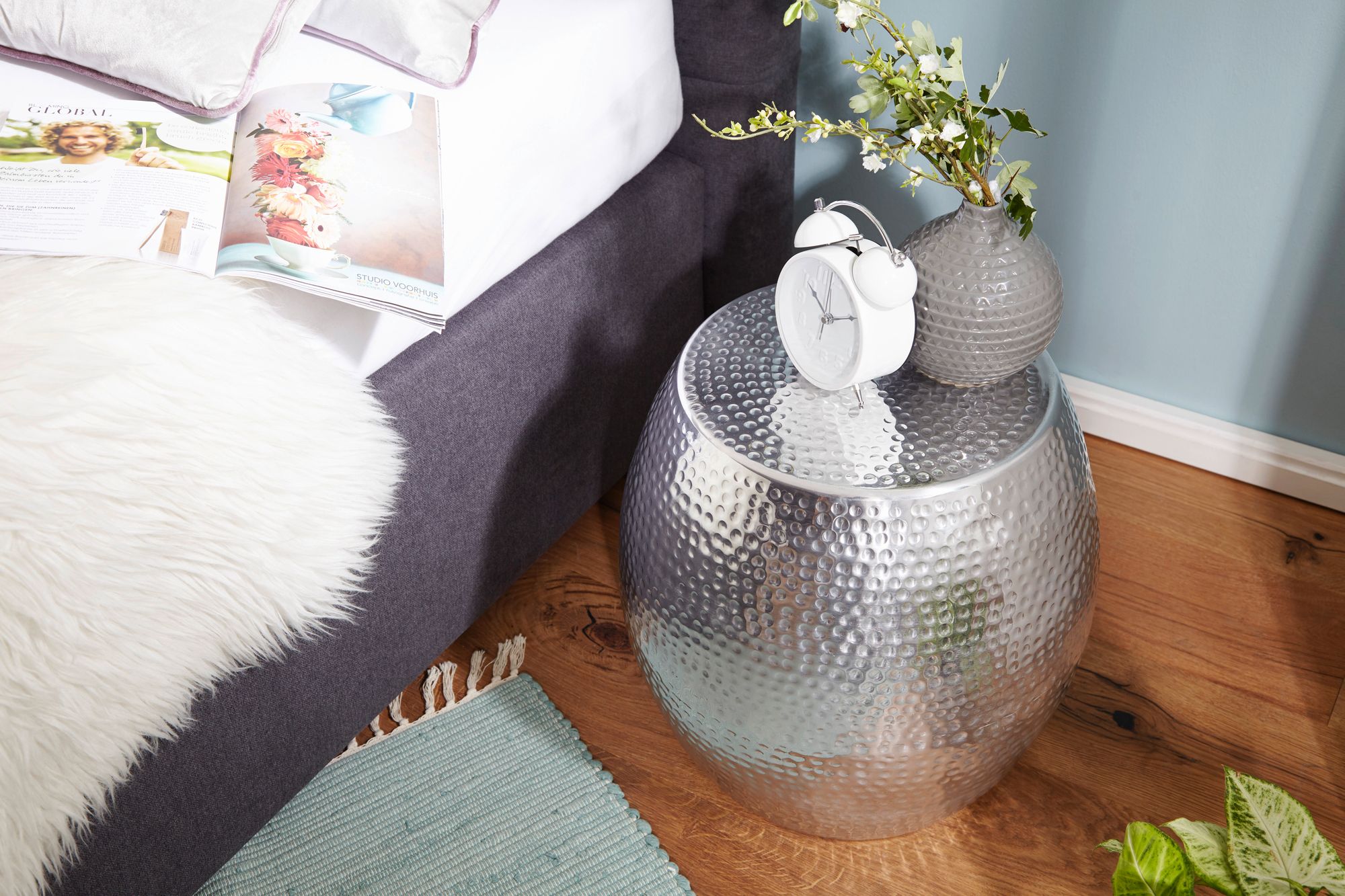 Verleihen Sie Ihrem Zuhause mit diesem silberfarbenen Beistelltisch aus Aluminium eine orientalische Eleganz. Die runde Form und die wunderschöne Hammerschlag-Struktur machen diesen Tisch zu einem echten Blickfang und Unikat, handgefertigt mit viel Liebe zum Detail.