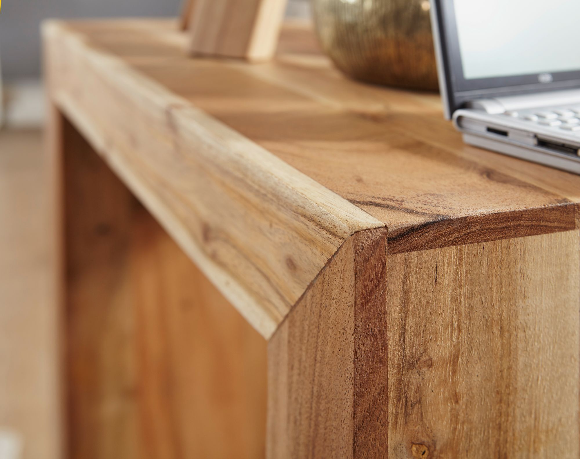 Der Beistelltisch MUMBAI aus massivem Akazienholz verbindet modernes Design mit Funktionalität. Die dunkel-natürliche Holzfarbe und die kompakten Maße machen ihn ideal als Ablagefläche im Wohnzimmer, auch in engen Ecken.
