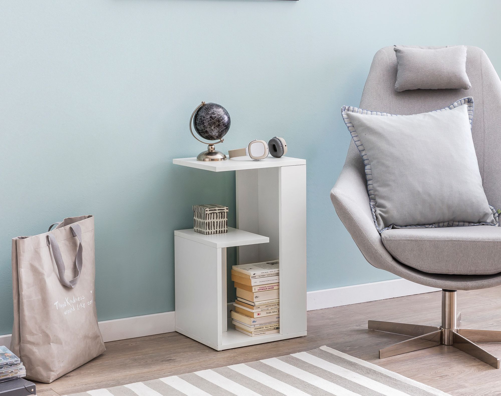 Dieser weiße Beistelltisch besticht durch modernes Design und bietet mit drei praktischen Ablageflächen viel Platz für Fernbedienungen, Zeitschriften, Getränke und Snacks. Trotz kompakter Maße passt er perfekt in kleine Räume.