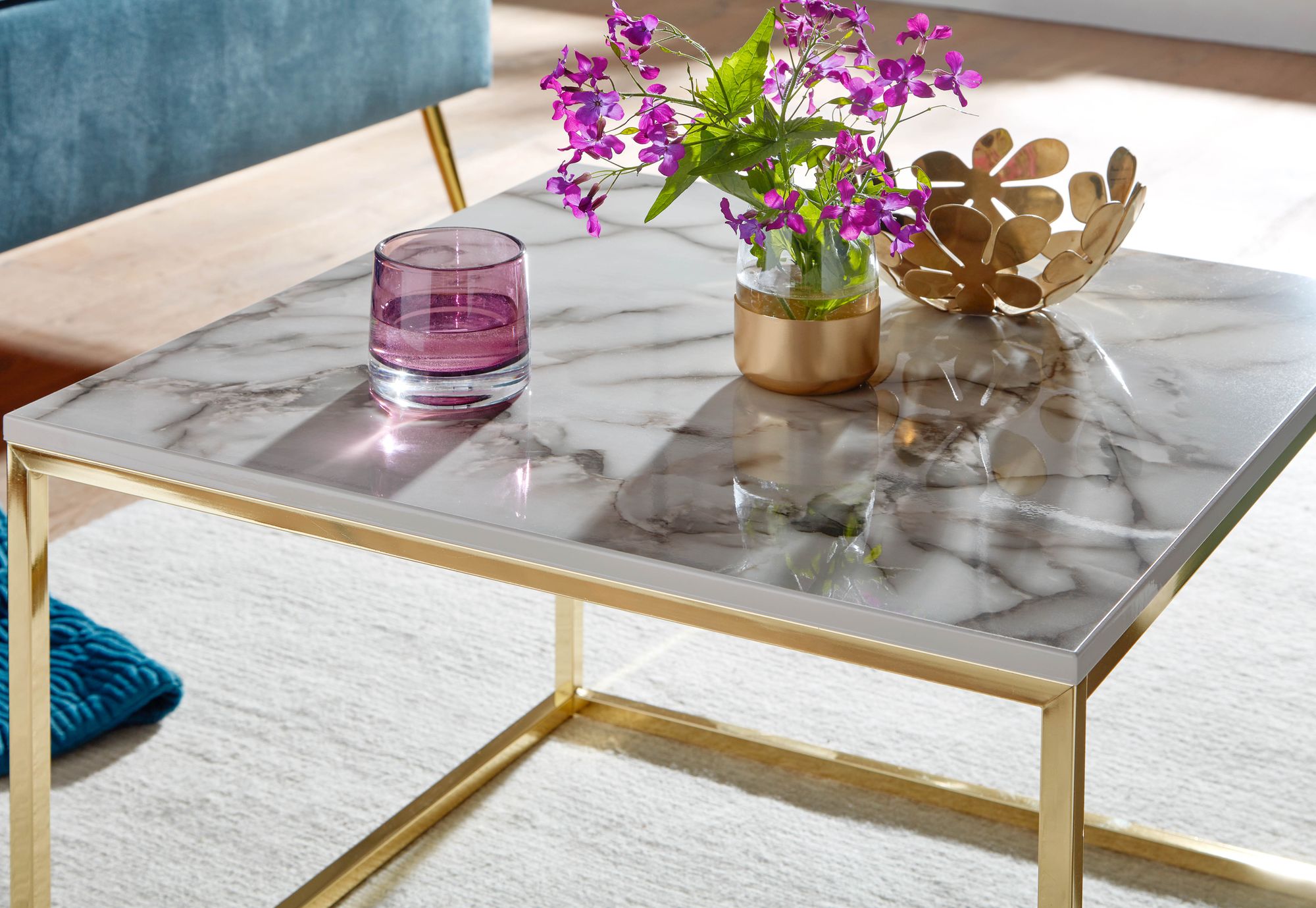 Verleihen Sie Ihrem Wohnzimmer mit diesem quadratischen Couchtisch in den Maßen 60x60x45 cm eine moderne Eleganz. Die Tischplatte aus foliertem MDF mit polyresinbeschichtung in Hochglanz Marmoroptik Weiß sorgt für eine hochwertige und langlebige Oberfläche. Das goldfarbene, lackierte Stahlgestell garantiert Stabilität und veredelt das Design.