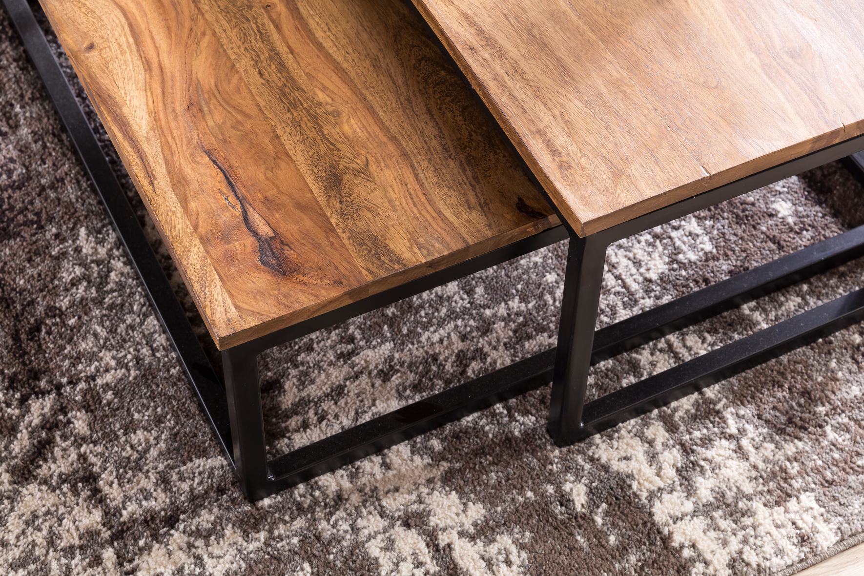 Der 2-teilige Couchtisch AKOLA vereint industrielles Design mit hochwertigen Materialien für Ihr Wohnzimmer. Handgefertigt aus massivem Sheeshamholz mit schützender PU-Lackierung garantiert er Langlebigkeit und einfache Pflege. Die matt schwarzen Metallbeine sorgen für Stabilität und modernen Stil.