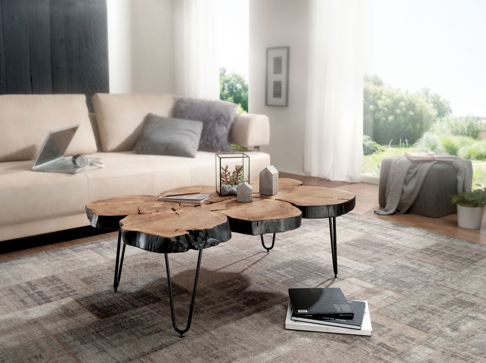 Der Couchtisch BAGLI aus massivem, natürlichem Akazienholz vereint elegantes Design mit Funktionalität. Mit sechs tischplatten in Baumstammform und vier stilvollen Metallbeinen bietet er viel Platz für das Wohnzimmer und einen warmen, klassischen Stil.