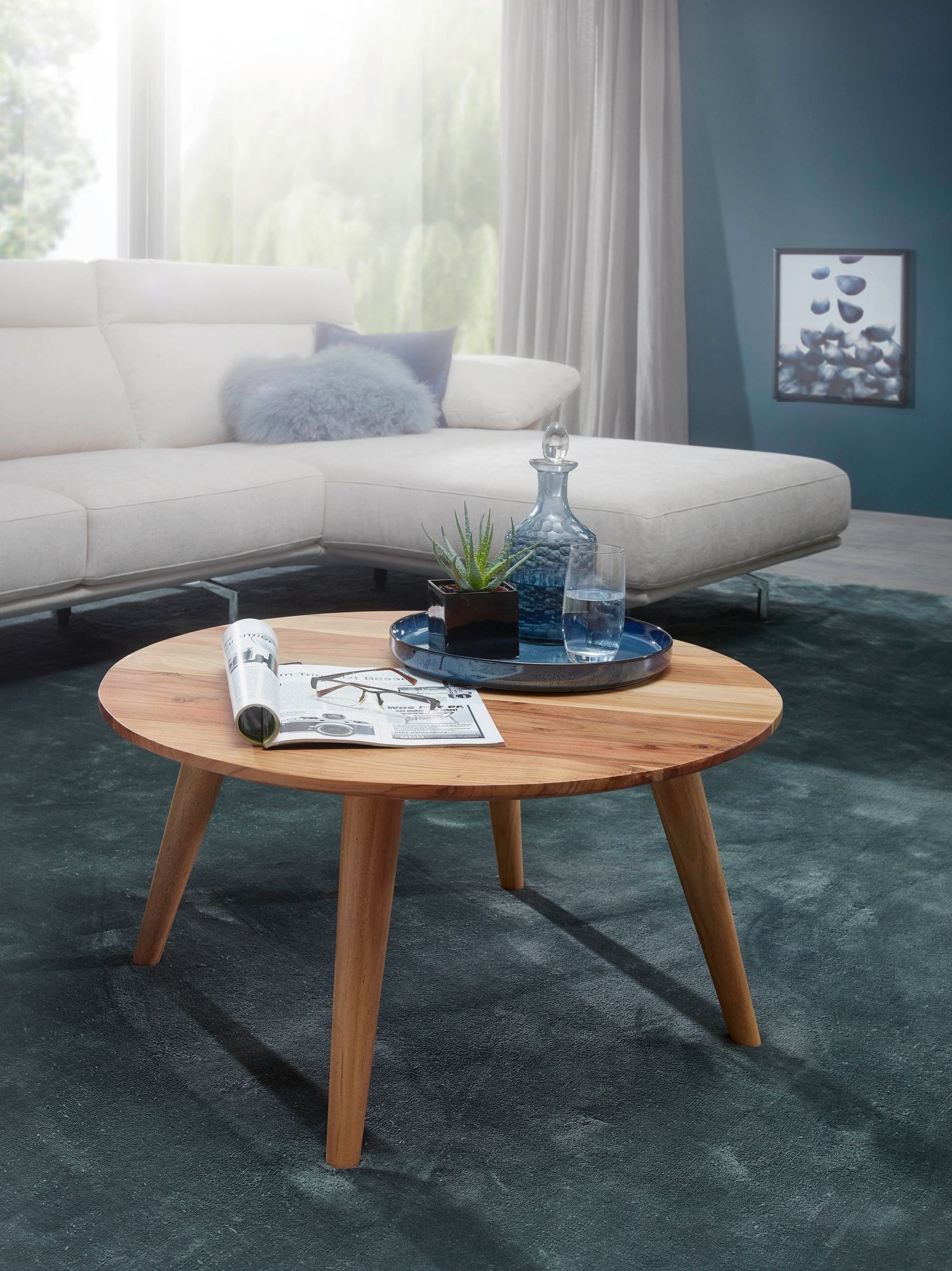 Der Couchtisch BOHA besticht durch seine runde Tischplatte aus massivem Akazienholz mit einem Durchmesser von 75 cm und verleiht Ihrem Raum einen natürlichen, einladenden Stil. Die vier nach außen geneigten Beine sorgen für erhöhte Stabilität und unterstreichen den rustikalen Charakter. Ideal zur Ergänzung anderer Massivholzmöbel aus Akazie.