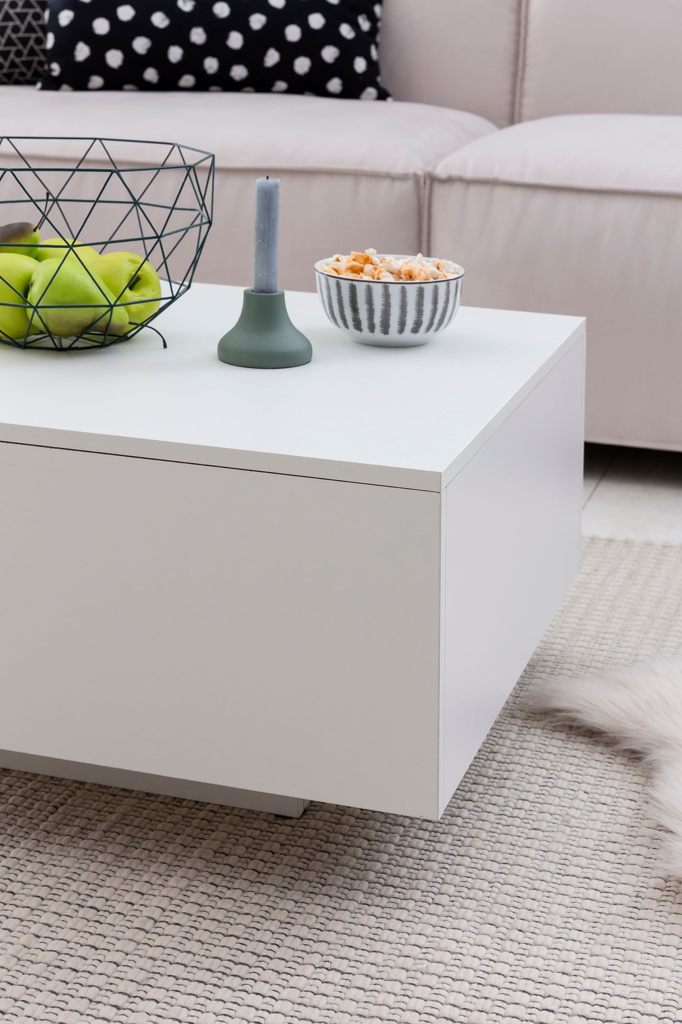 Moderner weißer Couchtisch aus Holz, der elegantes Design mit Funktionalität verbindet und Ihr Wohnzimmer aufwertet. Die großzügige Ablagefläche von 60 x 60 cm bietet viel Platz für Dekoration oder Kaffee.