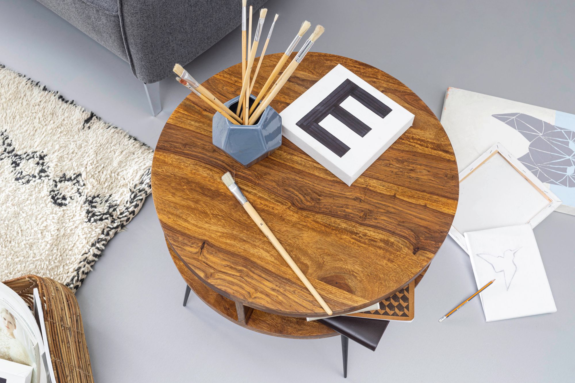 Dieser Couchtisch verbindet die Wärme von massivem Sheeshamholz mit der Robustheit von Metall zu einem praktischen modernen Design. Die runde Tischplatte mit 60 cm Durchmesser wird ergänzt durch vier seitliche Ablageflächen für kleine Gegenstände.