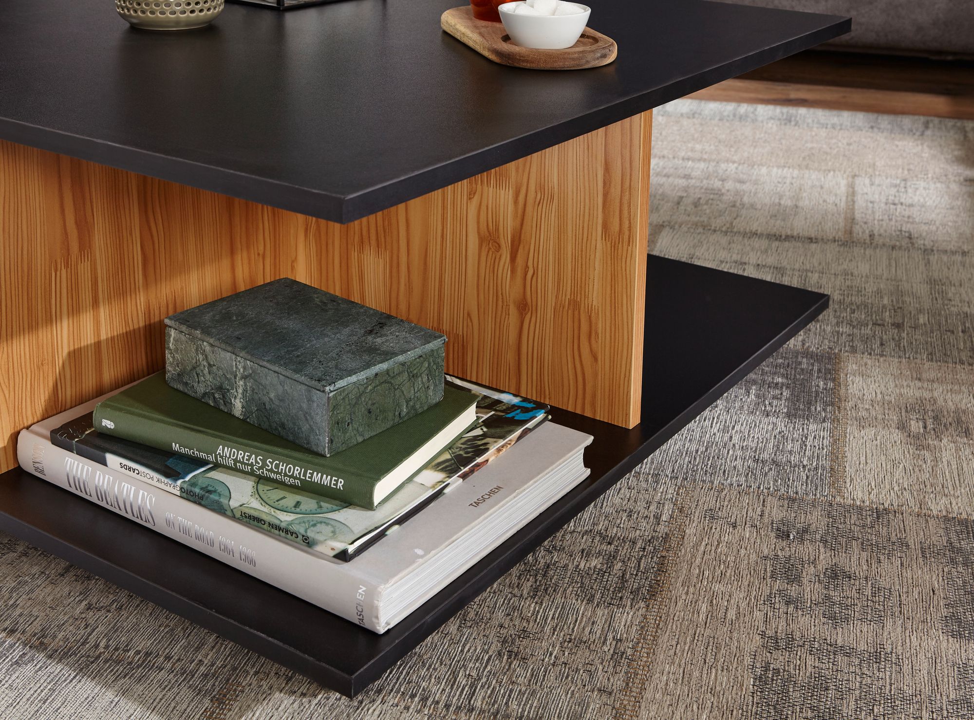 - Farbe: Tischplatte und Boden anthrazit, Schübe und Trenner in Sandeiche