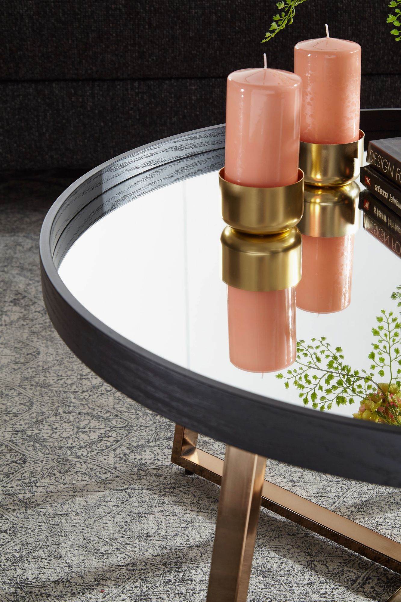 Design Couchtisch Rund | Dunkelgold Metallgestell mit Schwarz verspiegelter Glasplatte | Ø 78 cm, Höhe 42,5 cm