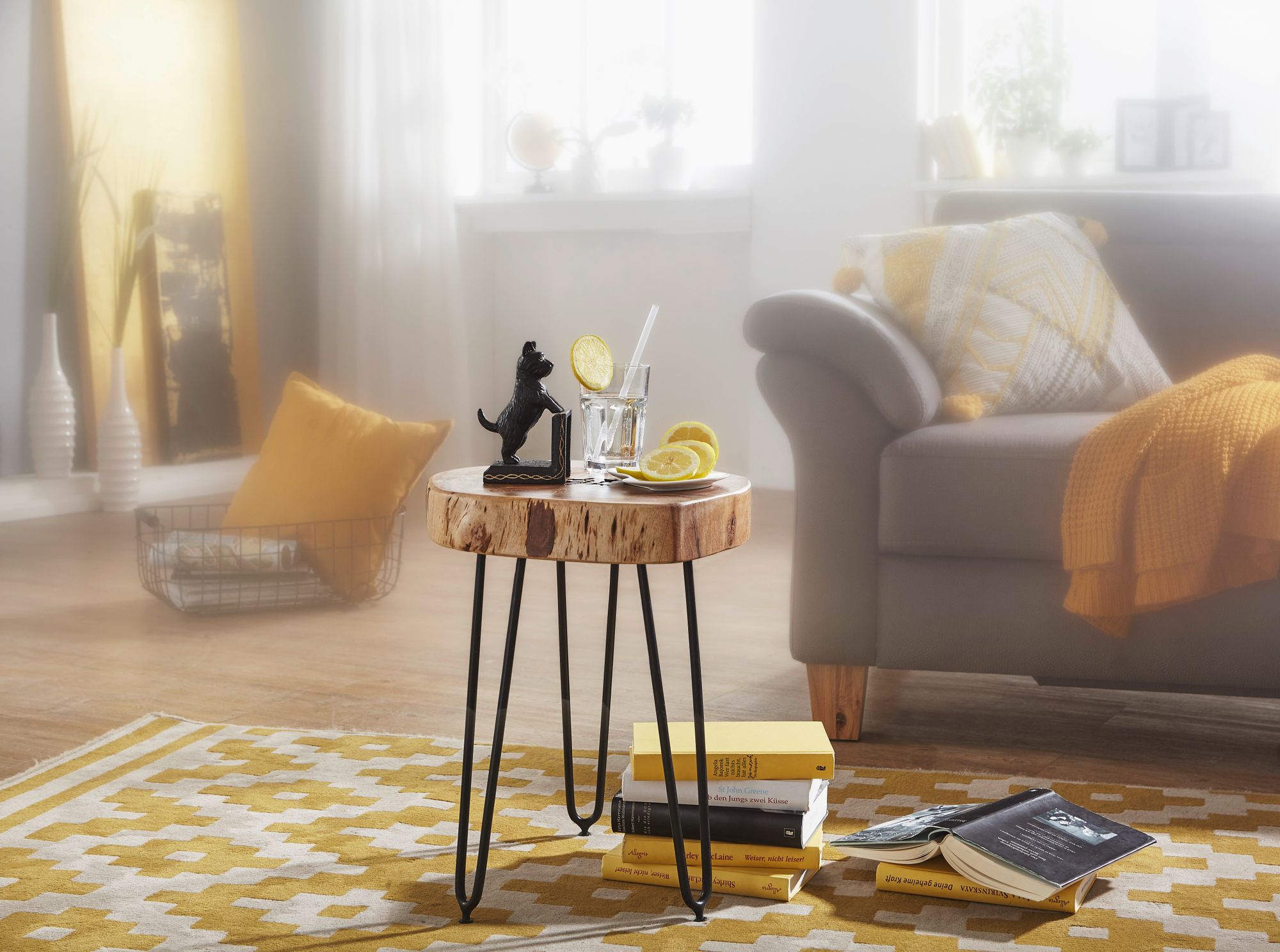 Verleihen Sie Ihrem Zuhause natürliche Eleganz mit dem Beistelltisch BAGLI aus massivem Akazienholz. Das Tischblatt mit Baumkante und drei formschönen Metallbeinen verbindet klassisches Design mit moderner Funktionalität.