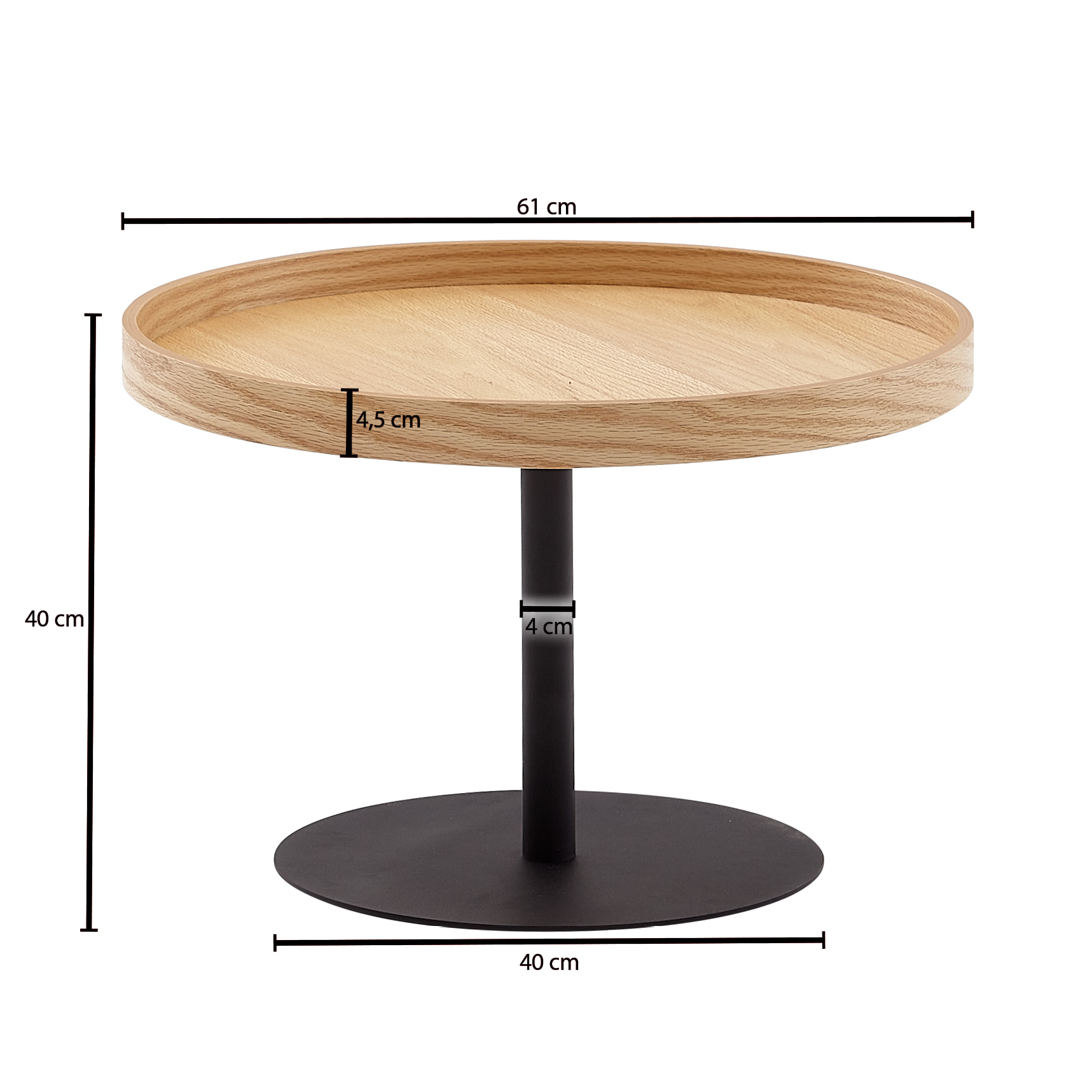 - Materialien: MDF mit Eichenfurnier, Tulpenholzring, pulverbeschichteter Stahl