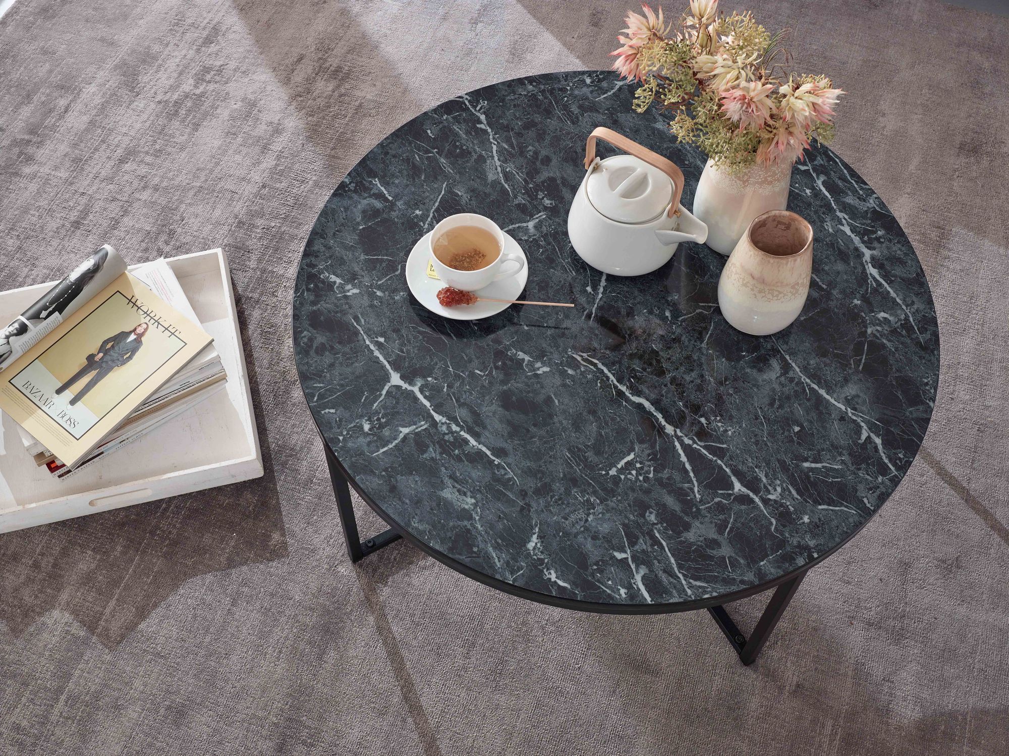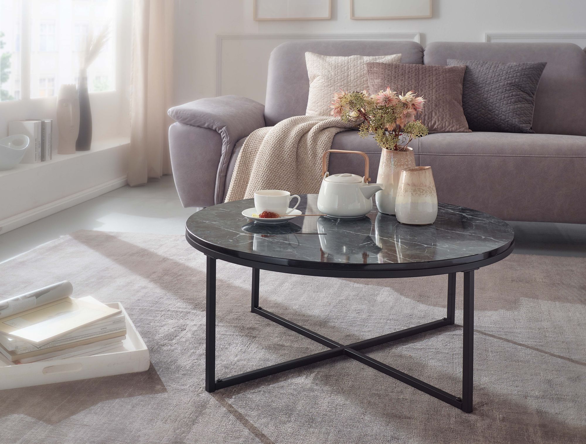 Dieser runde Couchtisch besticht durch eine elegante schwarze Marmor-Hochglanz-Optik und ein matt schwarzes Metallgestell, das einen modernen Stil verleiht. Das schlichte Design passt in verschiedene Wohnräume.