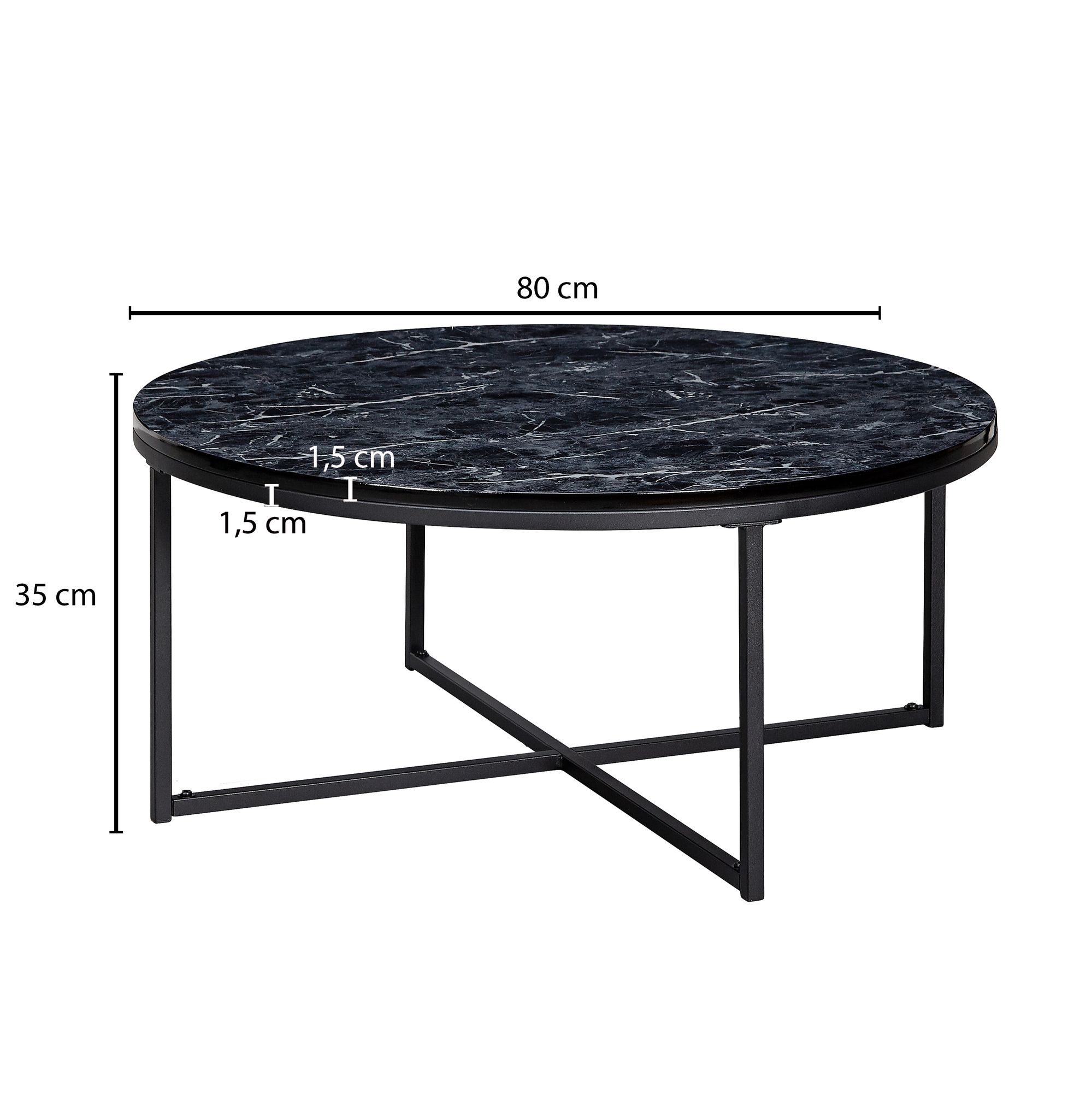 Runder Couchtisch Schwarz Marmor Optik Ø80x36 cm | Metallgestell Schwarz Matt | Moderner Wohnzimmertisch