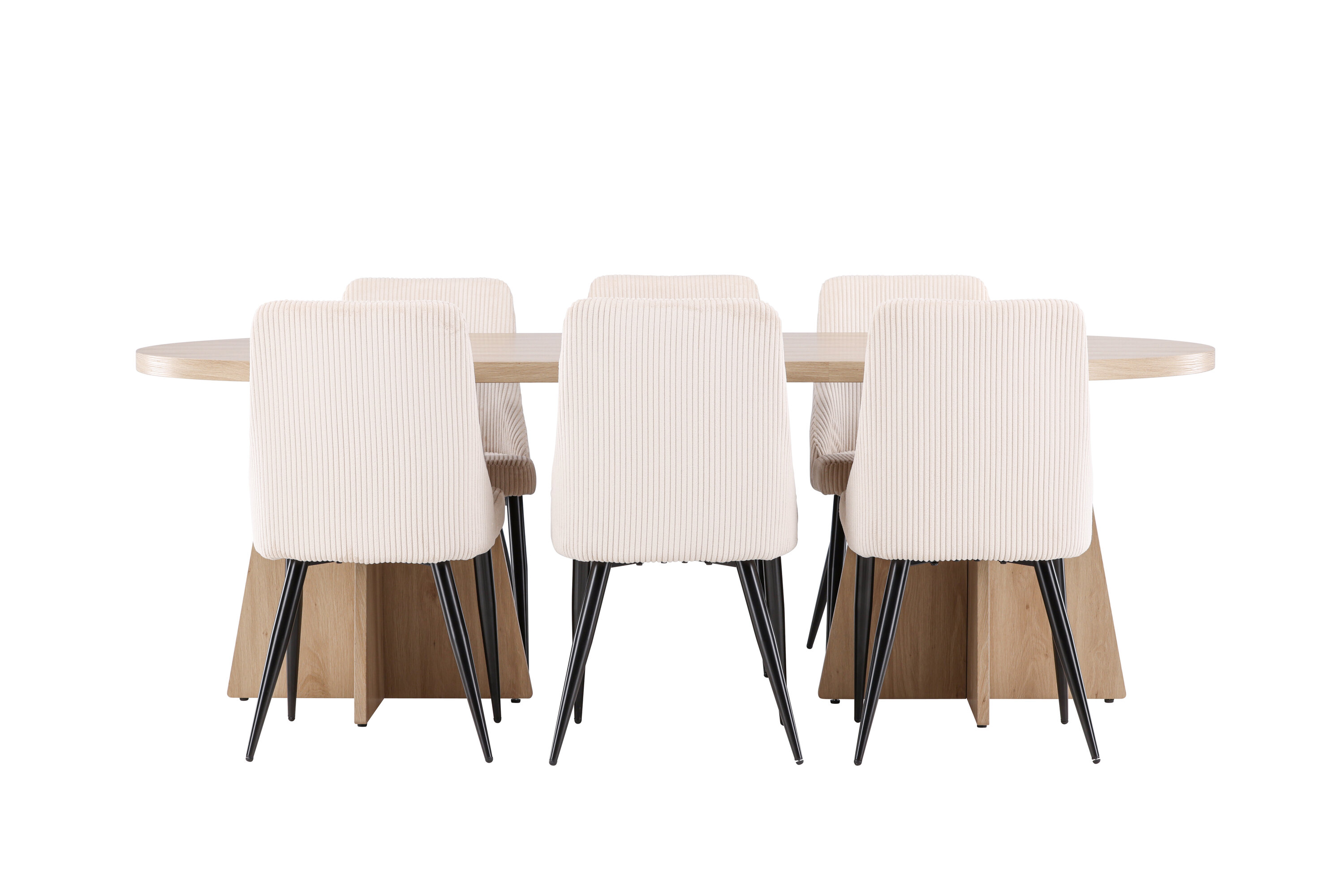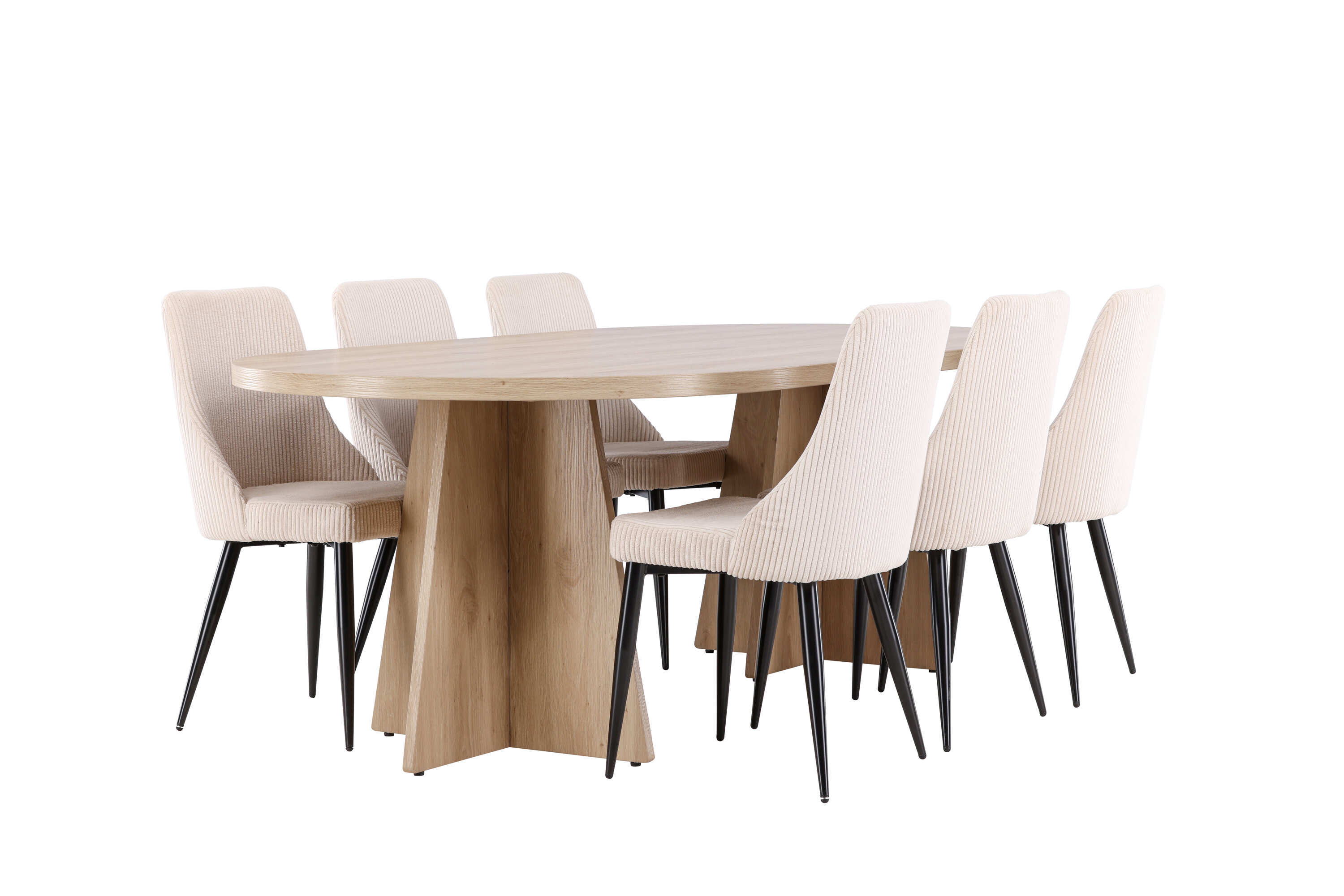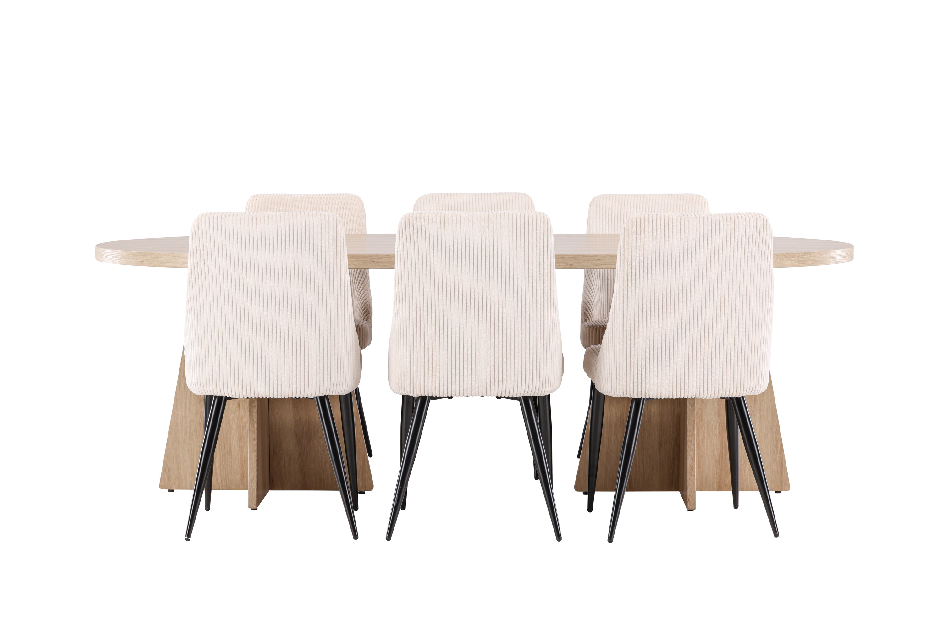 Entdecken Sie die perfekte Kombination aus Stil und Funktionalität mit dem Ess-Set, das den Leone-Essstuhl und den Bootcut-Esstisch umfasst. Gemeinsam schaffen sie eine elegante und einladende Atmosphäre für alle Ihre Mahlzeiten und gesellschaftlichen Zusammenkünfte. Der Stuhl ist FSC®-zertifiziert (FSC® C177288), d.h. er besteht aus Holz aus verantwortungsvoller Forstwirtschaft, Forstwirtschaft, die Mensch und Umwelt berücksichtigt. Leone ist der Esszimmerstuhl, der Stil und Komfort auf elegante Weise verbindet. Leone besteht aus Samt mit Stahlbeinen und bietet eine perfekte Balance zwischen Funktion und Ästhetik. Die weiche beige Farbe verleiht Leone ein warmes und einladendes Gefühl und macht es zu einer idealen Ergänzung für Ihren Esstisch oder Ihre Küche. Sein schlichtes Design macht ihn vielseitig und fügt sich perfekt in verschiedene Einrichtungsstile ein. Ob für tägliche Mahlzeiten oder besondere Anlässe, Leone bietet einen komfortablen und stilvollen Platz zum Sitzen. Geben Sie Ihrem Esszimmer einen Hauch von Eleganz und Komfort mit dem Leone Esszimmerstuhl, der Mahlzeiten zu einem Vergnügen macht. Mit seinem komfortablen Design und seiner stilvollen Ästhetik wird Leone zu einem beliebten Teil Ihres Zuhauses. Entdecken Sie die Schönheit und Funktionalität des Bootcut Esstisches - die perfekte Wahl, um unvergessliche Momente mit Freunden und Familie zu schaffen. Mit beeindruckenden Abmessungen von 230x115 cm bietet dieser Tisch viel Platz für gesellige Abendessen und lange Gespräche. Der Bootcut-Esstisch kommt in einer herrlichen weiß getünchten Farbe, die Ihrem Raum ein erdiges Gefühl verleiht. Sein skandinavisches Design und seine klaren Linien tragen zu einer stilvollen und modernen Atmosphäre in Ihrem Zuhause bei. Schaffen Sie eine einladende Atmosphäre und lassen Sie den Bootcut-Esstisch zum Mittelpunkt Ihrer gesellschaftlichen Zusammenkünfte werden. Ob für Familienessen oder festliche Anlässe, dieser beeindruckende Tisch wird jede Veranstaltung unvergesslich machen. Geben Sie Ihrem Zuhause einen Hauch von schlichter Eleganz und Gemeinschaft mit dem Bootcut Esstisch - ein perfekter Ort, um Ihre Lieben zu versammeln und bleibende Erinnerungen zu schaffen.