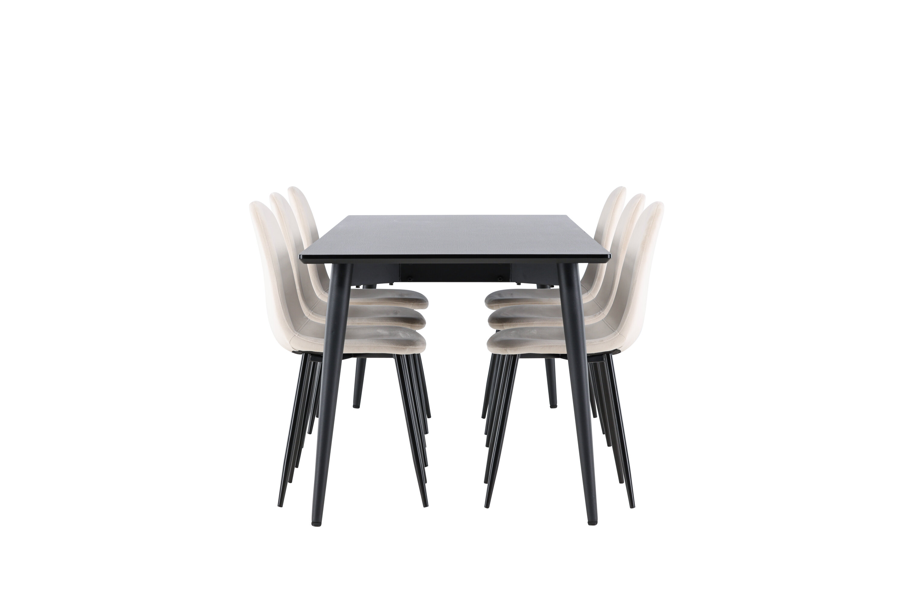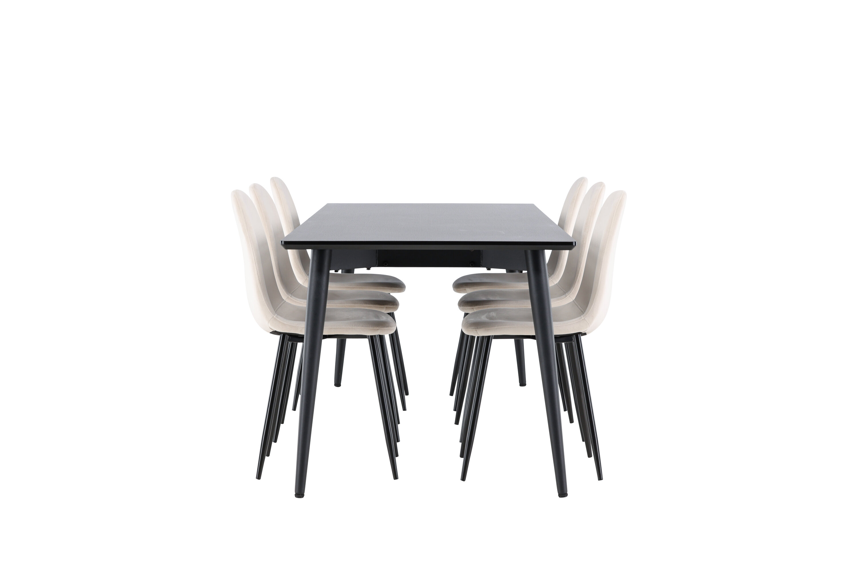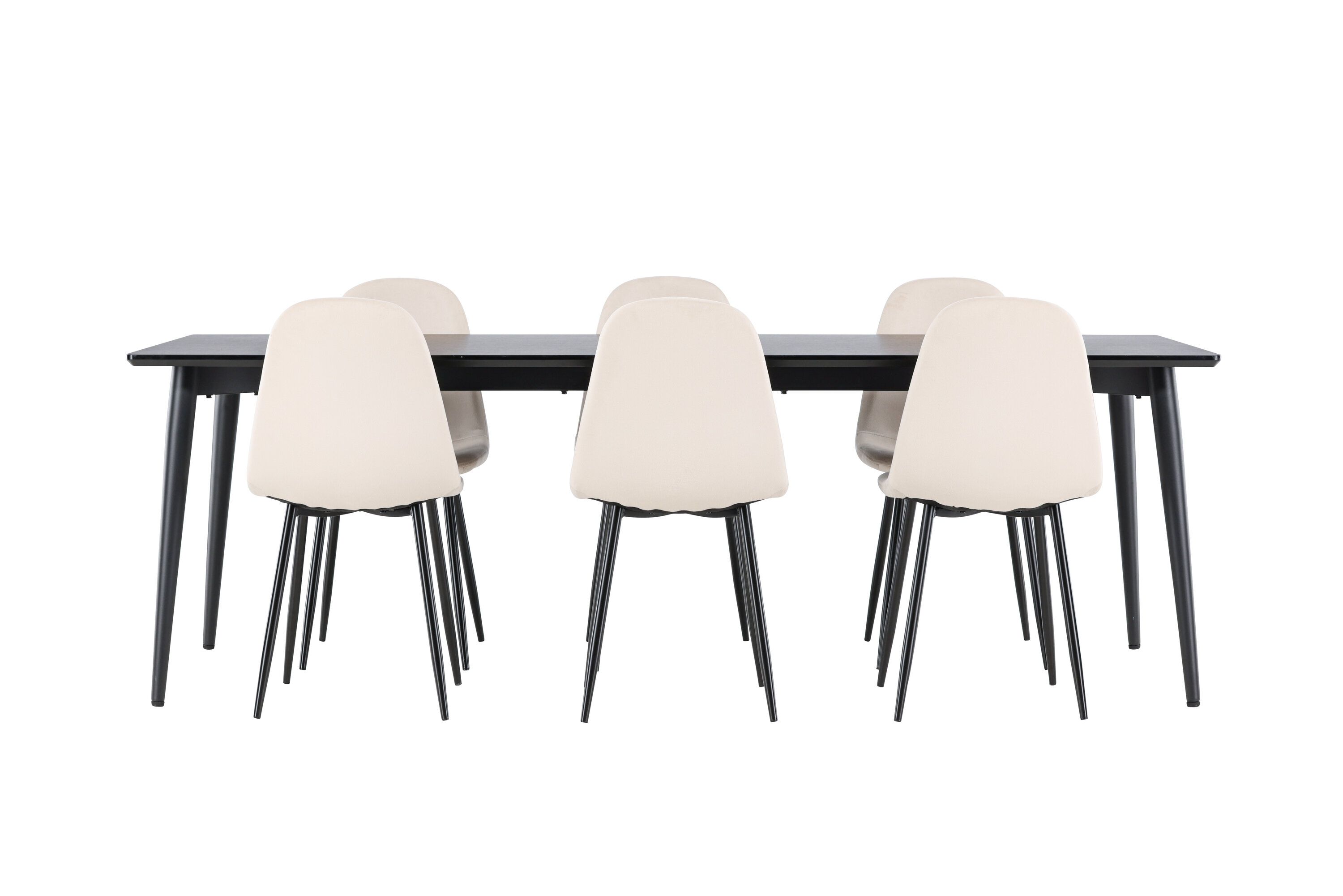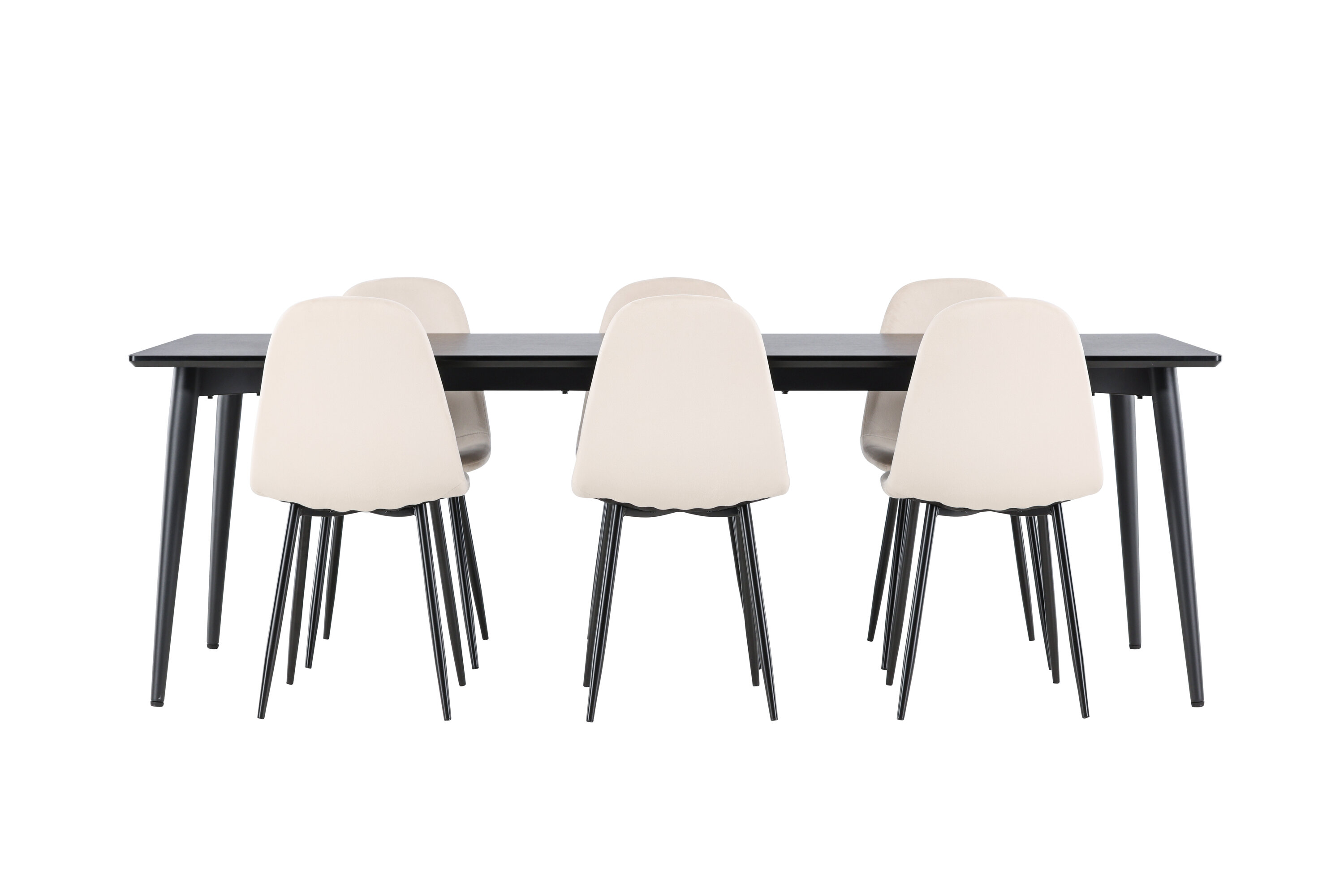Entdecken Sie das perfekte Esszimmer-Set mit dem Polar Esszimmerstuhl und dem Ellis Esstisch - eine Kombination, die sowohl Eleganz als auch Robustheit für Ihr Zuhause ausstrahlt. Polar ist ein moderner Traumstuhl in stilvollem Beige. Dieser Esszimmerstuhl verfügt über ein komplett gepolstertes Design mit einer leicht abgerundeten Rückenlehne und Sitzfläche aus Samt sowie Beinen aus schwarzem, pulverbeschichtetem Metall. Es ist sowohl komfortabel als auch auffällig und eignet sich perfekt, um das Herz des Hauses einladend und gemütlich einzurichten. Genießen Sie köstliche Mahlzeiten mit Familie und Freunden! Entdecken Sie Ellis, den robusten Esstisch, der zum Herzstück Ihrer Essumgebung wird. Mit seiner schwarzen Farbe verleiht Ellis Ihrem Zimmer eine elegante und moderne Note. Der Tisch besteht aus Stahlbeinen und einer MDF-Tischplatte, die eine perfekte Balance zwischen Robustheit und Stil bietet. Mit seinen großzügigen Abmessungen von 230 x 85 cm eignet sich der Ellis-Tisch perfekt für gesellschaftliche Abendessen und Zusammenkünfte mit Freunden und Familie. Verleihen Sie Ihrem Essbereich mit dem Polar Esszimmerstuhl und dem Ellis Esstisch ein aktualisiertes Gefühl von Eleganz und Stil. Dieses Ess-Set schafft eine trendige und stilvolle Atmosphäre und bietet eine Balance zwischen zeitlosem Design und modernen Details, was es zur perfekten Wahl für alltägliche Abendessen und festliche Anlässe macht.