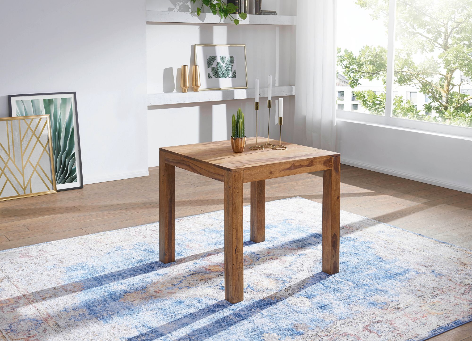 Der quadratische Esstisch MUMBAI aus massivem Sheeshamholz ist perfekt für kleinere Räume. Die dunkelbraune Oberfläche betont das edle und einzigartige Material.