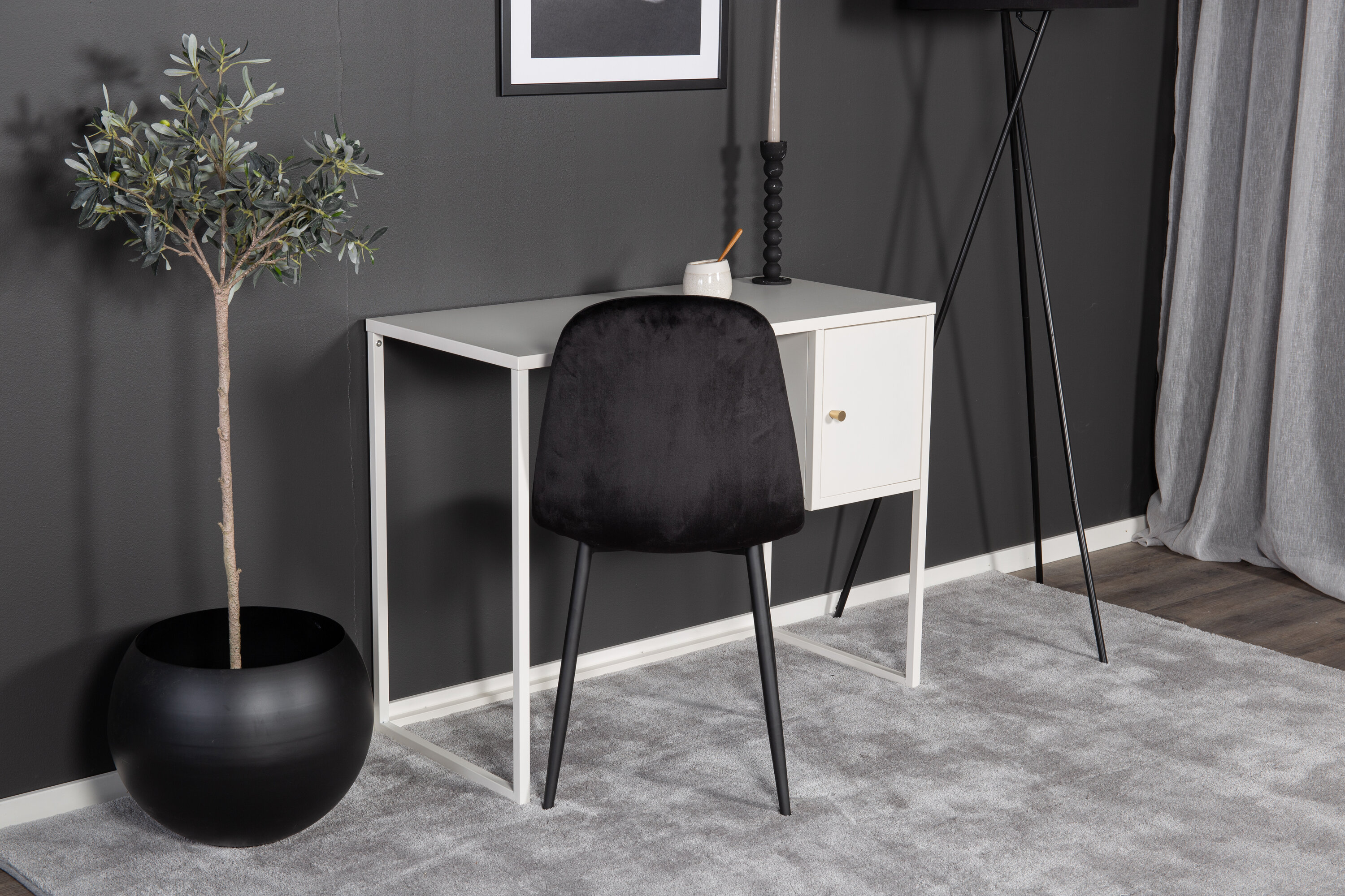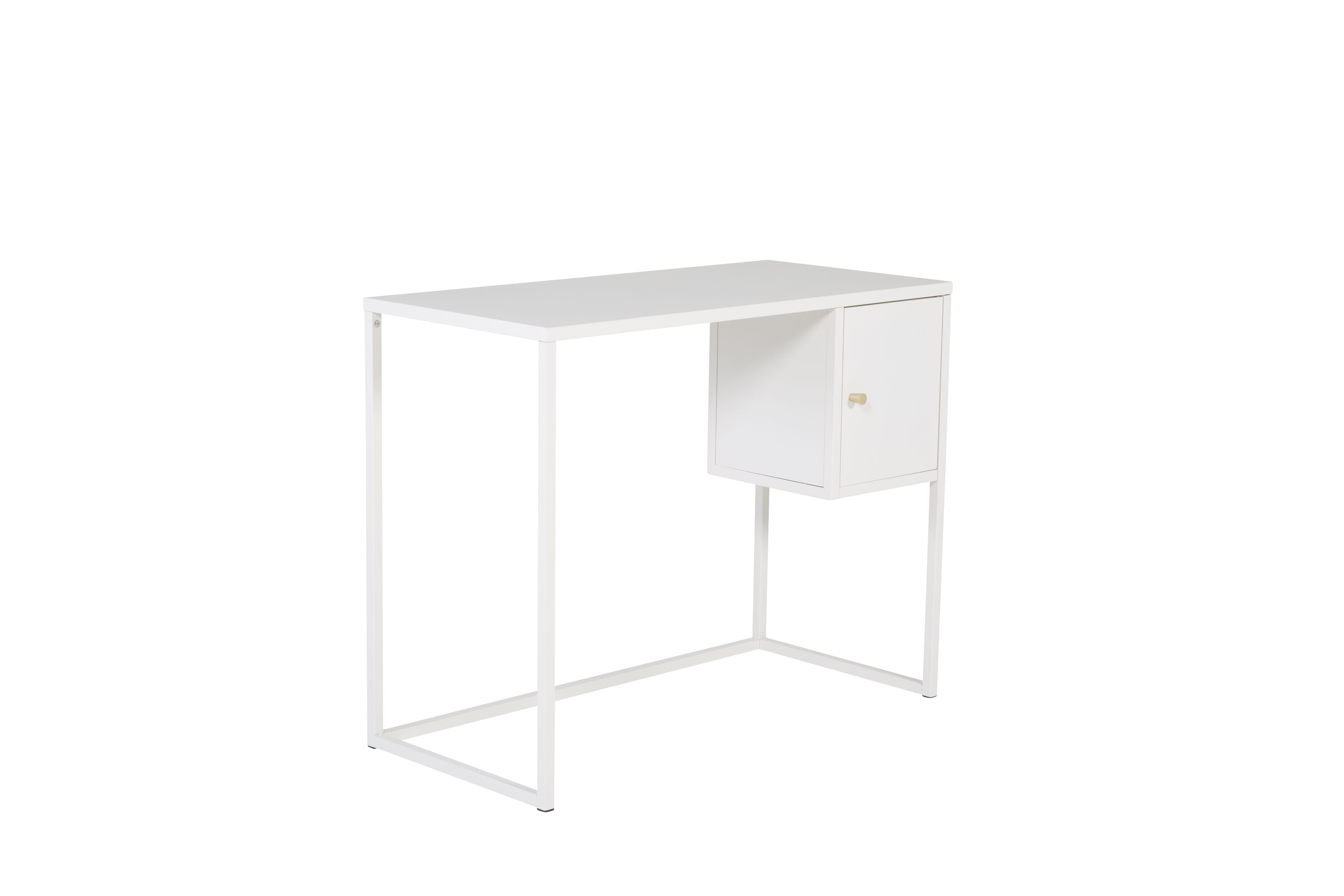 Baktal, ein hübscher Schreibtisch im modernen Industriedesign mit integriertem Rahmen und quadratischem Unterschrank. Eine kleinere Tür mit verstecktem Stauraum und einer in der rechten Ecke platzierten Relieffläche aus weiß pulverbeschichtetem Stahl. Die Tür hat eine messingfarbene Knospe. Maße: Länge: 95 cm, Breite: 45 cm, Höhe: 50 cm. Leichtere Montage ist erforderlich.