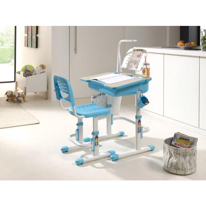 Ergonomischer und funktioneller Kinderschreibtisch mit Höhenverstellung und passendem Schreibtischstuhl, aus der Comfort Serie in der Farbe Weiß/Blau. Hiermit bekommen Sie für Ihr Kind ein komplettes Set für das Kinderzimmer. Der Kinderschreibtisch und ebenso der Stuhl haben ein stabiles, weiß lackiertes Metallrohrgestell. Die ausladenden Füße bieten eine hohe Standfestigkeit von Tisch und Stuhl. Zudem befinden sich in den Kunststoffkappen der Füße jeweils Höhenversteller für die Feinjustierung. Die Schreibplatte (Maße der Arbeitsfläche ca.: B: 70,5x T: 54,5 cm) ist aus hochwertigem und strapazierfäigem MDF, ummantelt mit einer ABS-Dickkante. Die Kanten der Platte sind alle gerundet und vorne an der Einbuchtung befindet sich eine Abrutschperre. Oberhalb befindet sich ein feststehendes Element mit Stifteschalen und Montagevorrichtung für den Bücherhalter und der LED Schreibtischlampe (beides aus Kunststoff). Die Beleuchtung ist CE zertifiziert, hat 12 W und eine Farbtemparatur von 6000 K. Unter der aufklappbaren Schreibplatte befindet sich ein breites und geräumiges Fach (stabiler Kunststoff) für Schreibmaterial und Utensilien. Damit ist immer alles griffbereit. Die in der Neigung verstellbare Schreibplatte (von 0 - 6,5° Neigung) ermöglicht eine ergonomisch optimale Haltung beim Lesen, Malen oder Schreiben. Dies wird auch durch die Höhenverstellung des Tischgestells unterstützt. Sie können das Gestell in der Arbeitshöhe von 54 cm bis zu 76 cm verstellen. Gleichfalls gehören zum Lieferumfang ein Taschenhalter und Stiftebecher dazu, der auf den Taschenhalter gesteckt werden kann. Der Schreibtischstuhl hat einen strapazierfähigen, geformten Sitz und Rücken aus Kunststoff. Für die bessere Luftzirkulastion haben beide Lüftungsschlitze. Auch der Stuhl ist höhenverstellbar und kann von 30 cm bis zu 44 cm Sitzhöhe angepasst werden. So lässt sich der Schreibtisch und der Stuhl ergonomisch optimal aufeinander abstimmen. Der Artikel ist zerlegt mit Aufbauanleitung zur einfachen Selbstmontage. Die Stellfläche beträgt für den Tisch ca. B: 71 x H: 54-76 x T: 54,5 cm, Stellfläche für den Stuhl ca.: B: 36,5 x H: 65,3-79,3 x T: 41,8 cm. Empfohlenes Alter: Kinder von 3 - 10 Jahre. Der Artikel ist nach EN71-3 gebaut.